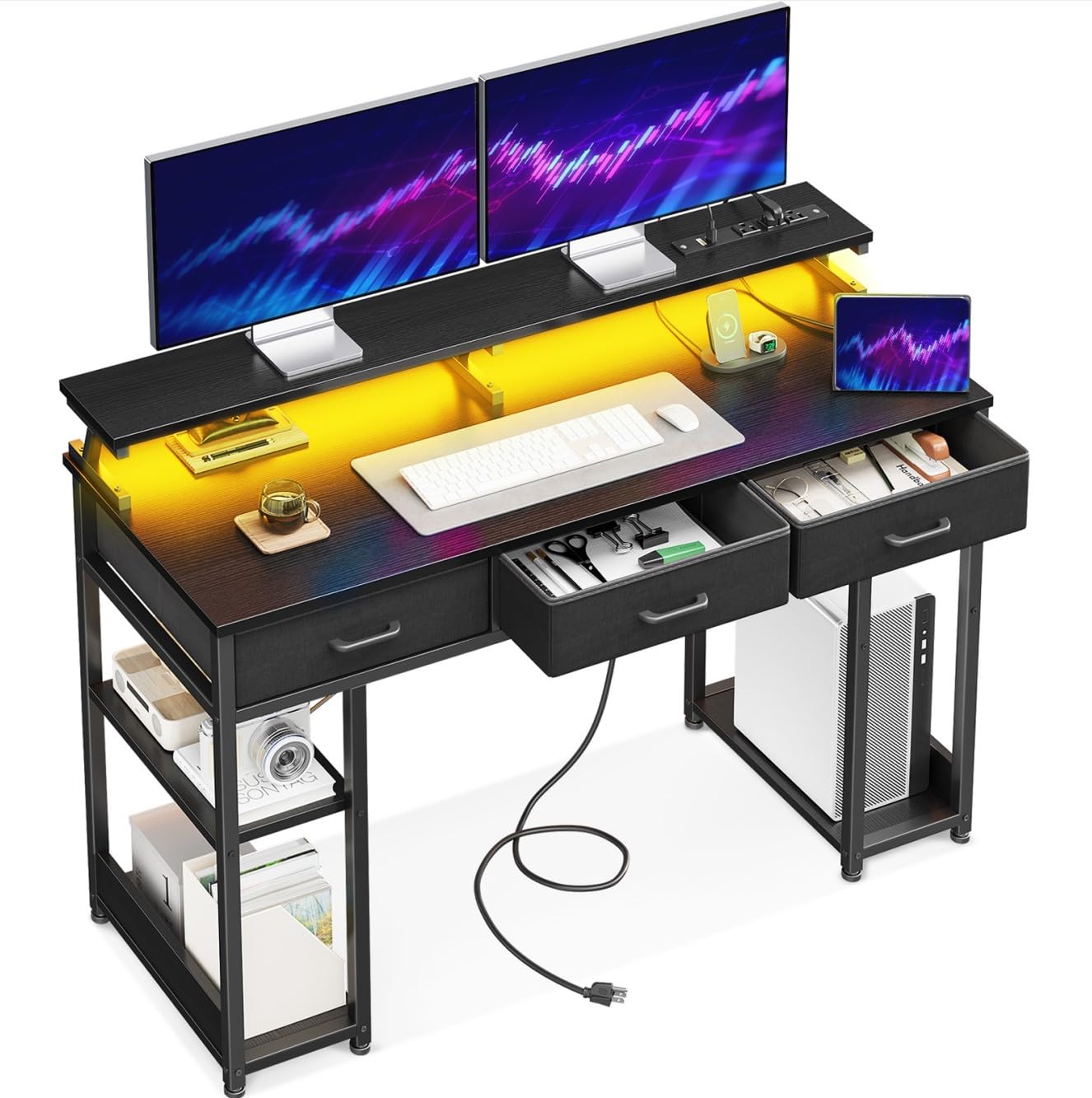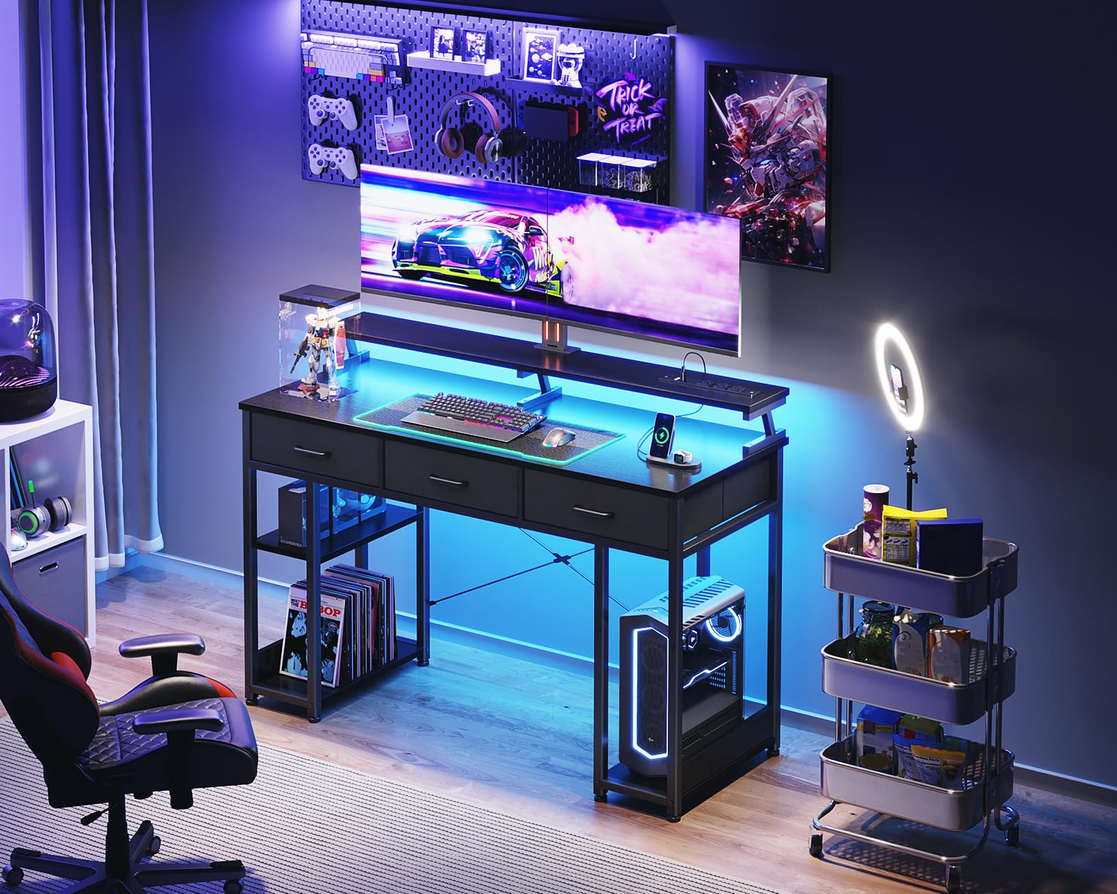 48 inch Computer Desk with 3 Drawers, Gaming Desk with LED Lights & Power Outlets