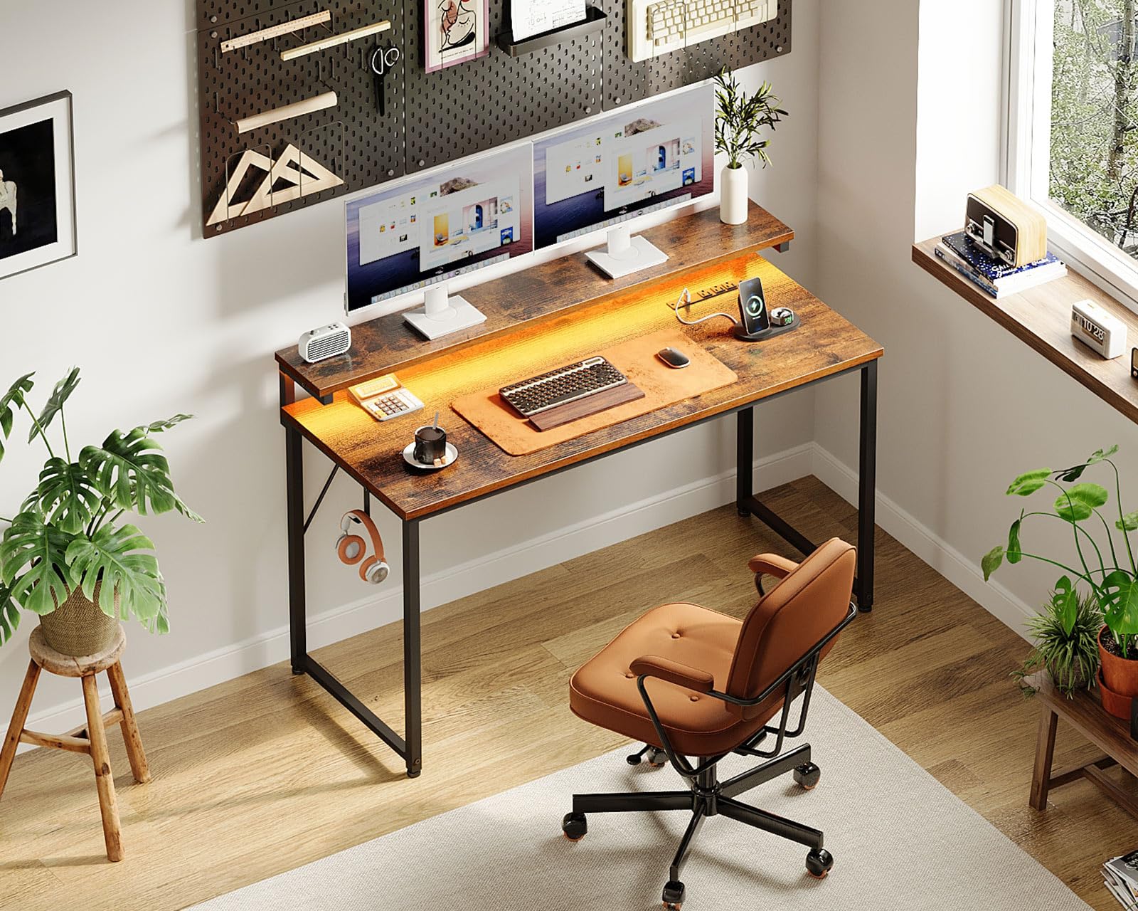 Computer Desk, 48 Inch Gaming Desk with LED Lights and Power Outlet, Office Desk with Adjustable Monitor Shelf (3 Heights), Computer Table Work Desk for Home/Bedroom, Rustic Brown