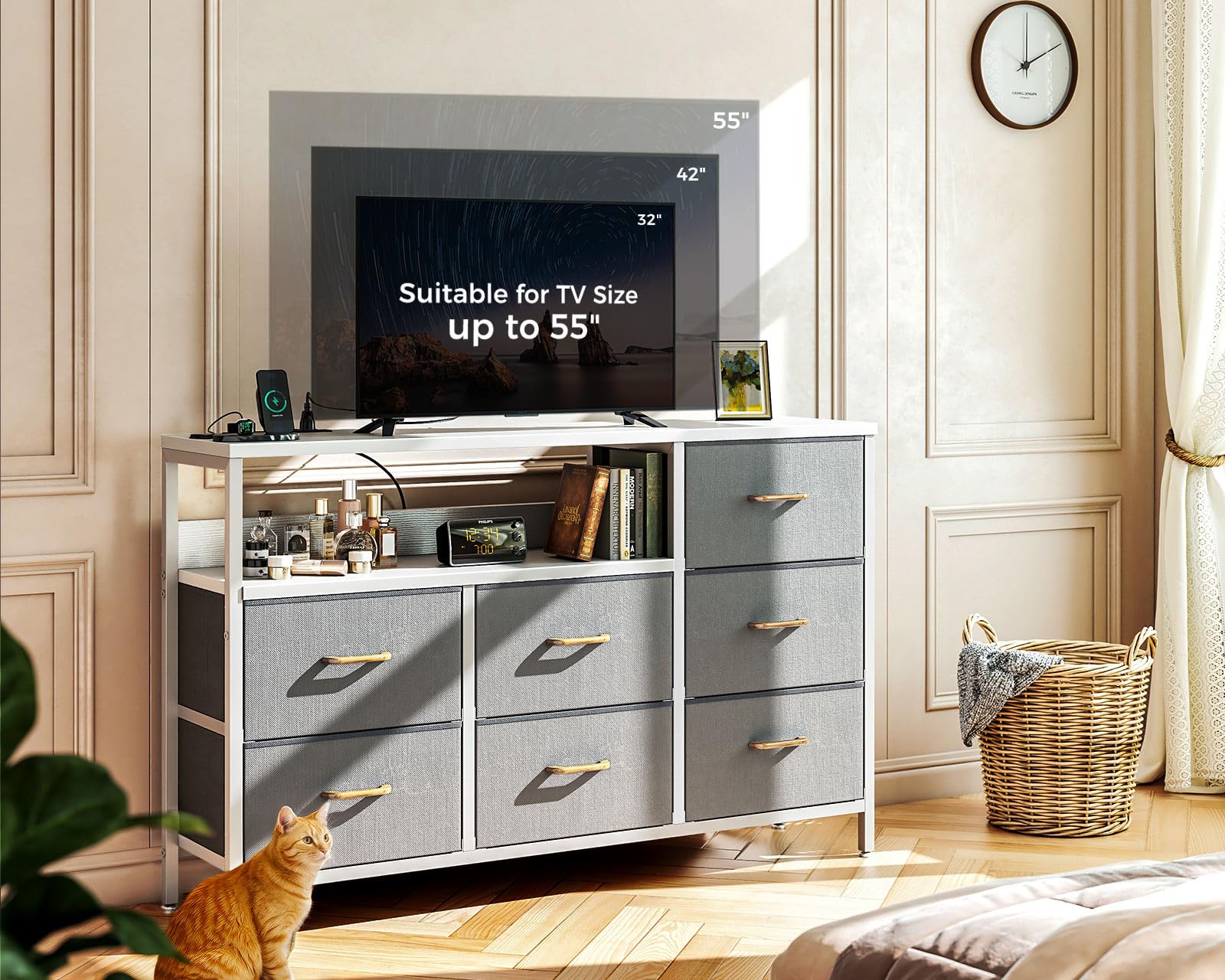 Dresser with Charging Station, 52-Inch Long Dresser for Bedroom with 7 Large Fabric