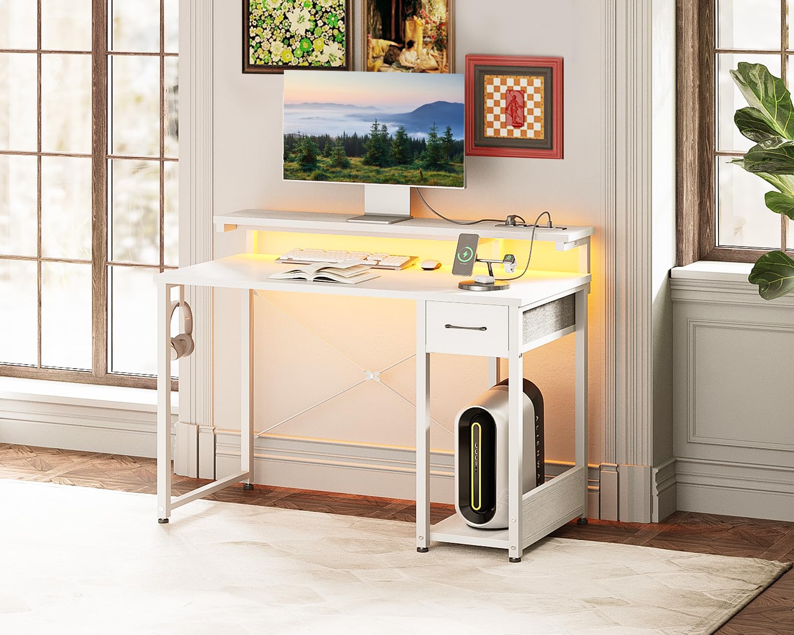 Gaming Desk with LED Lights & Power Outlet, 40 Inch Computer Desk with Drawer,
