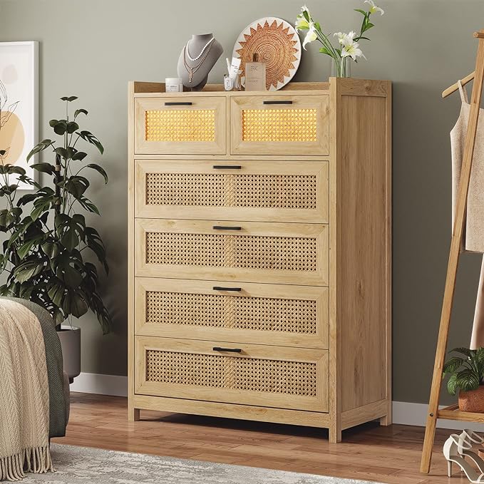 6 Drawer Dresser for Bedroom, Natural Rattan Wood Dressers with Led Light,