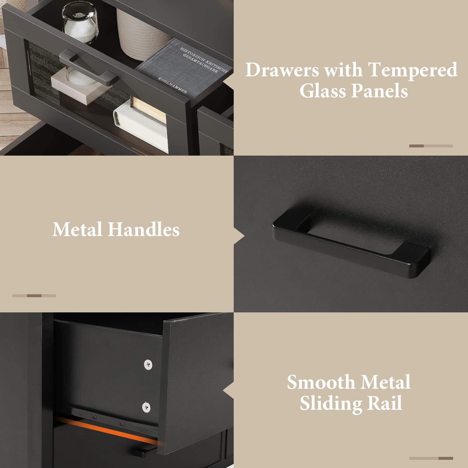 - Wood frame offers stable support for all wood drawers, and the tempered glass element in the 3 wood top drawers adds a soft and warm atmosphere to the LED dresser. Thanks to the perfect mix of wood and glass, this chest of drawers is even more unique and attractive. Glass element keep your favourite items free from dust but still visible.