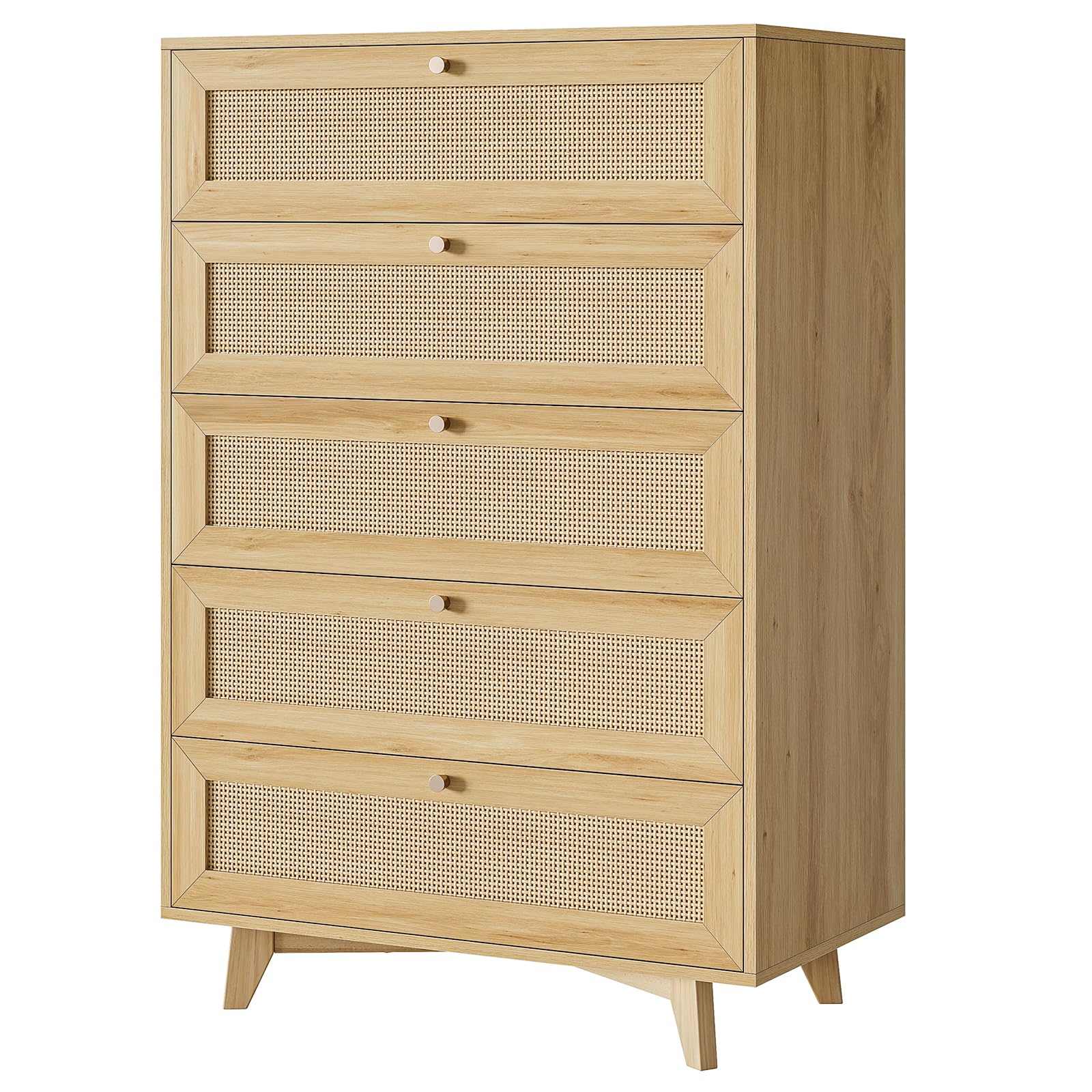 AOGLLATI Rattan Dresser for Bedroom with 5 Drawer, Modern Double Wooden Tall Bedroom Dresser, Chest of Drawers with Metal Handle & Solid Wood Legs for Bedroom/Living Room,