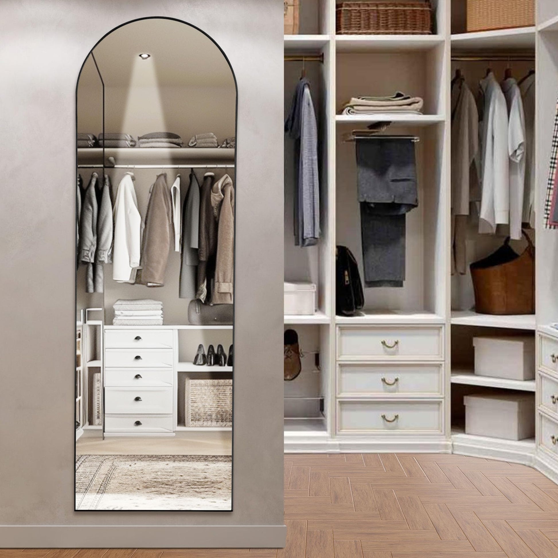 Elevate your space with this elegant arched full-length mirror, designed to bring both functionality and sophisticated style to your bedroom, living room, or dressing area. The sleek black aluminum alloy frame features a modern thin profile that complements any décor, while the generous size provides a complete head-to-toe reflection.