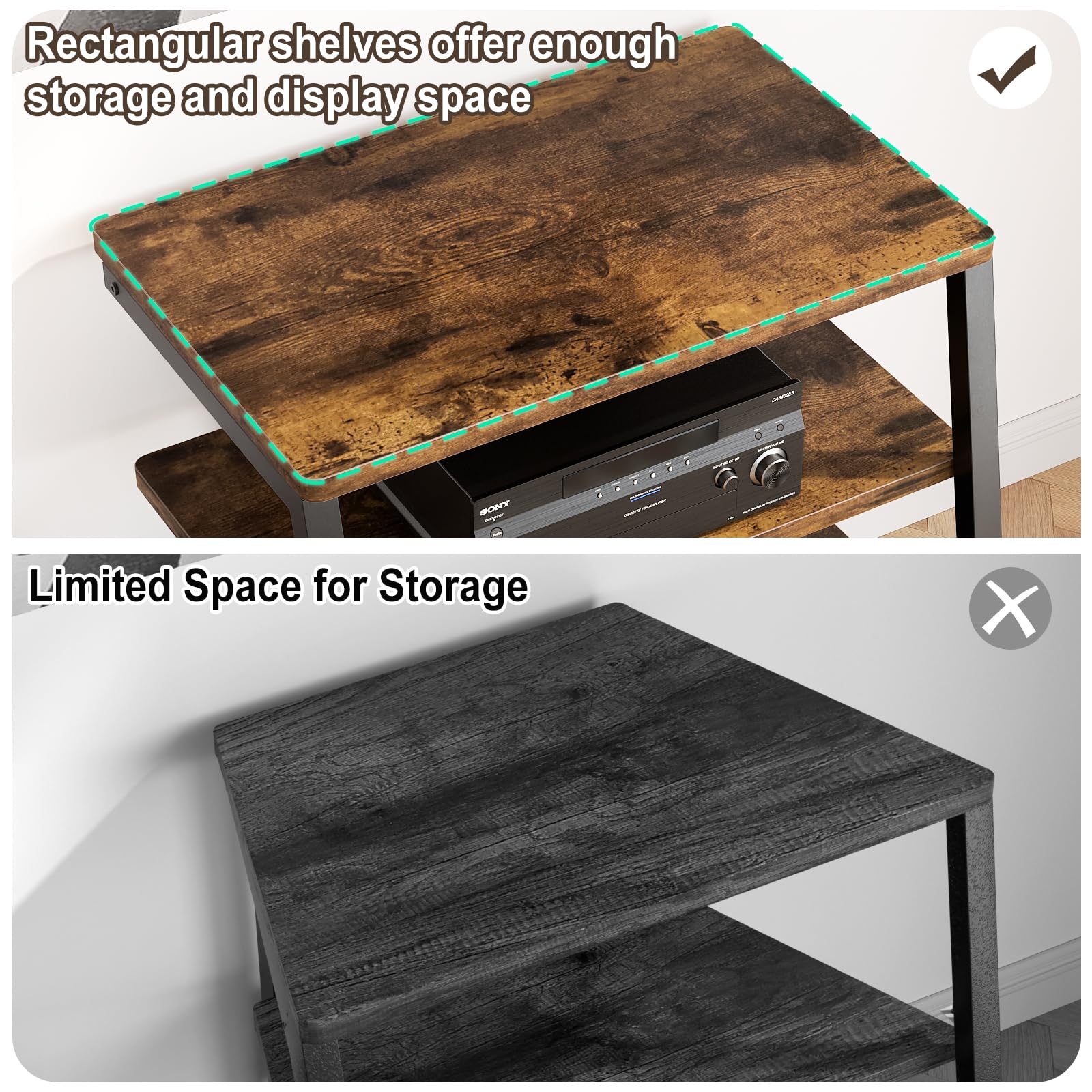 - 23.6'' wide shelf boards that this media stand has offer you enough space to place your stereo equipment. The open construction and 4-tier adjustable shelves will make your setup easier and more convenient. The open construction also means that your electronics aren't going to overheat, because air is circulating freely all the time. Plenty of clearance for gaming consoles, DVD players, a cable box, a sound system woofer, and a CD changer.
