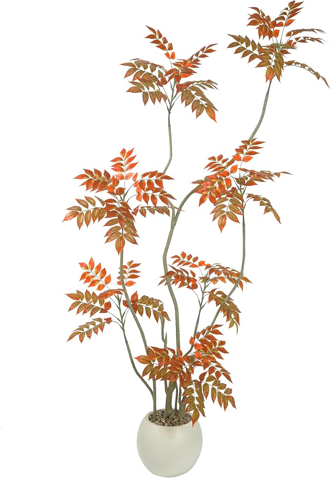- Home Decor Accents: This 6ft/70in tall faux sumac tree contains 500 pieces real touch leaves who made of silk and each leaf has veins on it. Inclus a white planter(10"H x 10"W). The interior of the planter is made of sturdy concrete and the surface is decorated with non-falling coloured pebbles and the base use anti-tip tilt protection for greater stability