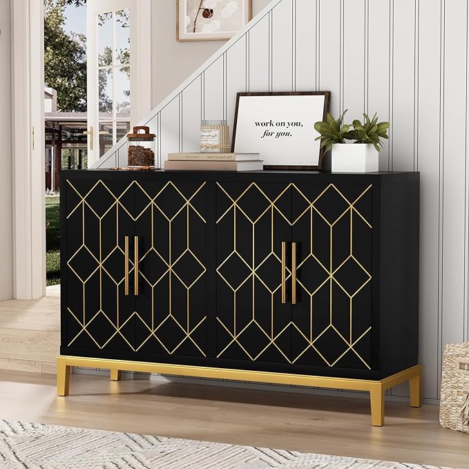 - This accent storage cabinet is crafted with exquisite gold herringbone carved texture on 4 doors, adding a unique Bohemian style to your home. Combined with gold handles and base on the doors, the sideboard looks elegant and outstanding.