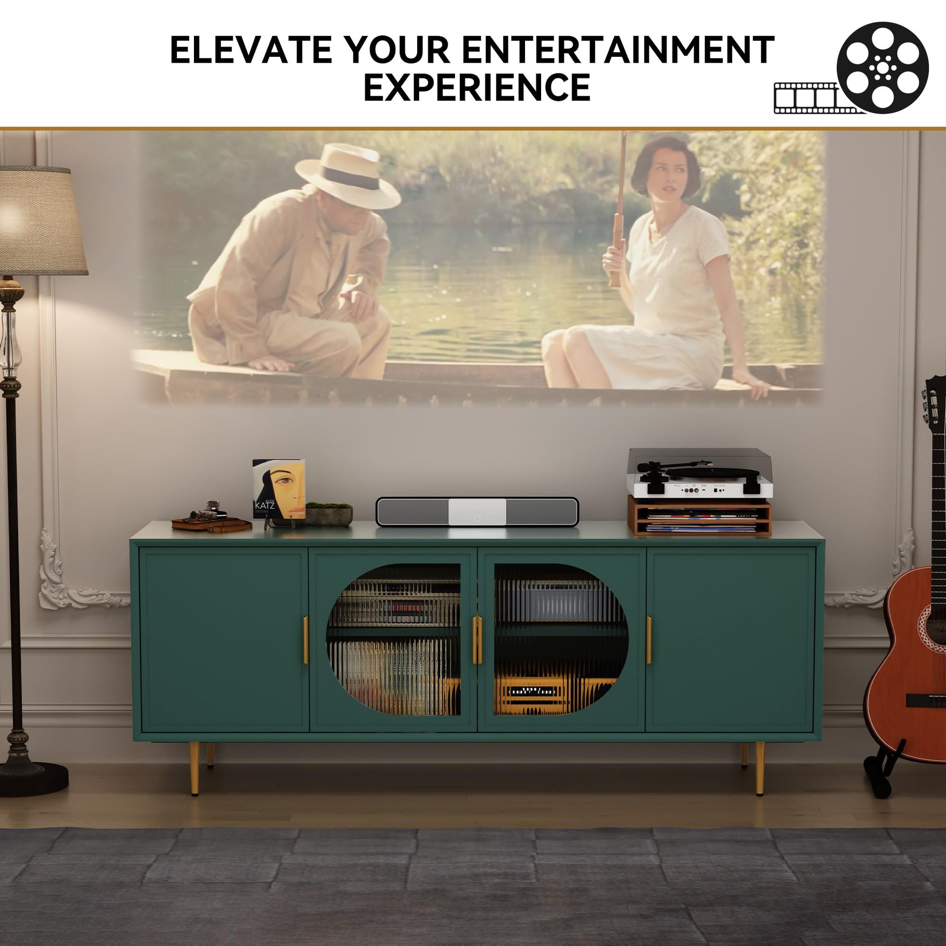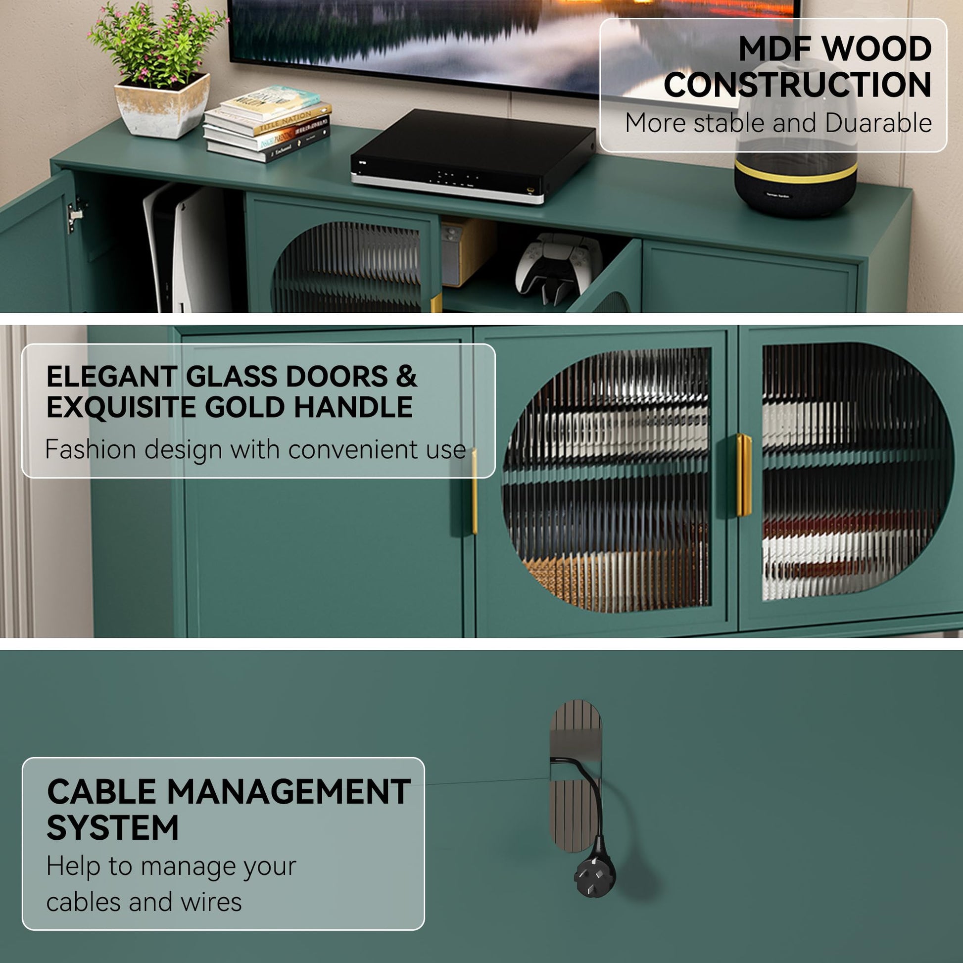 - Modern Design with Versatility This Green entertainment console table not only serves as a TV stand but also doubles as a multifunctional storage cabinet. It’s stylish design with clean lines and golden alloy handles make it a perfect addition to any room, be it the living room, bedroom, or elsewhere. Cleaning is a breeze thanks to its smooth surface, so you won't have to worry about maintenance.