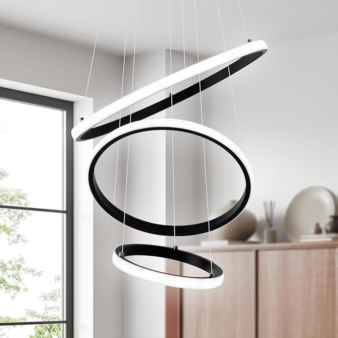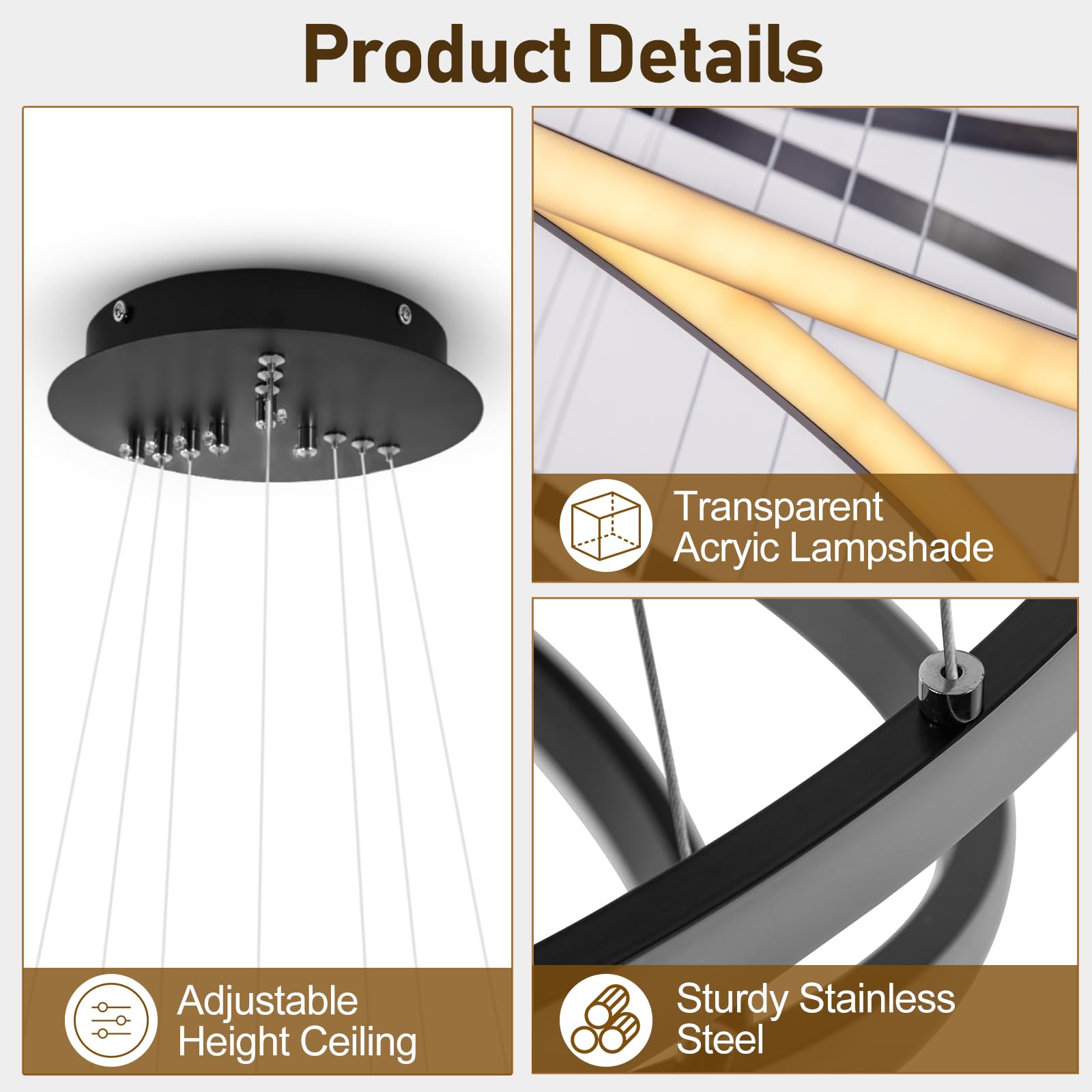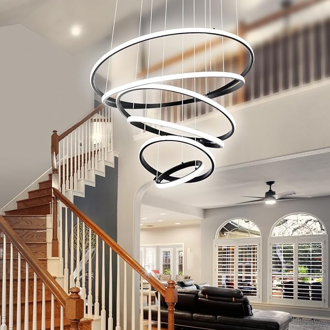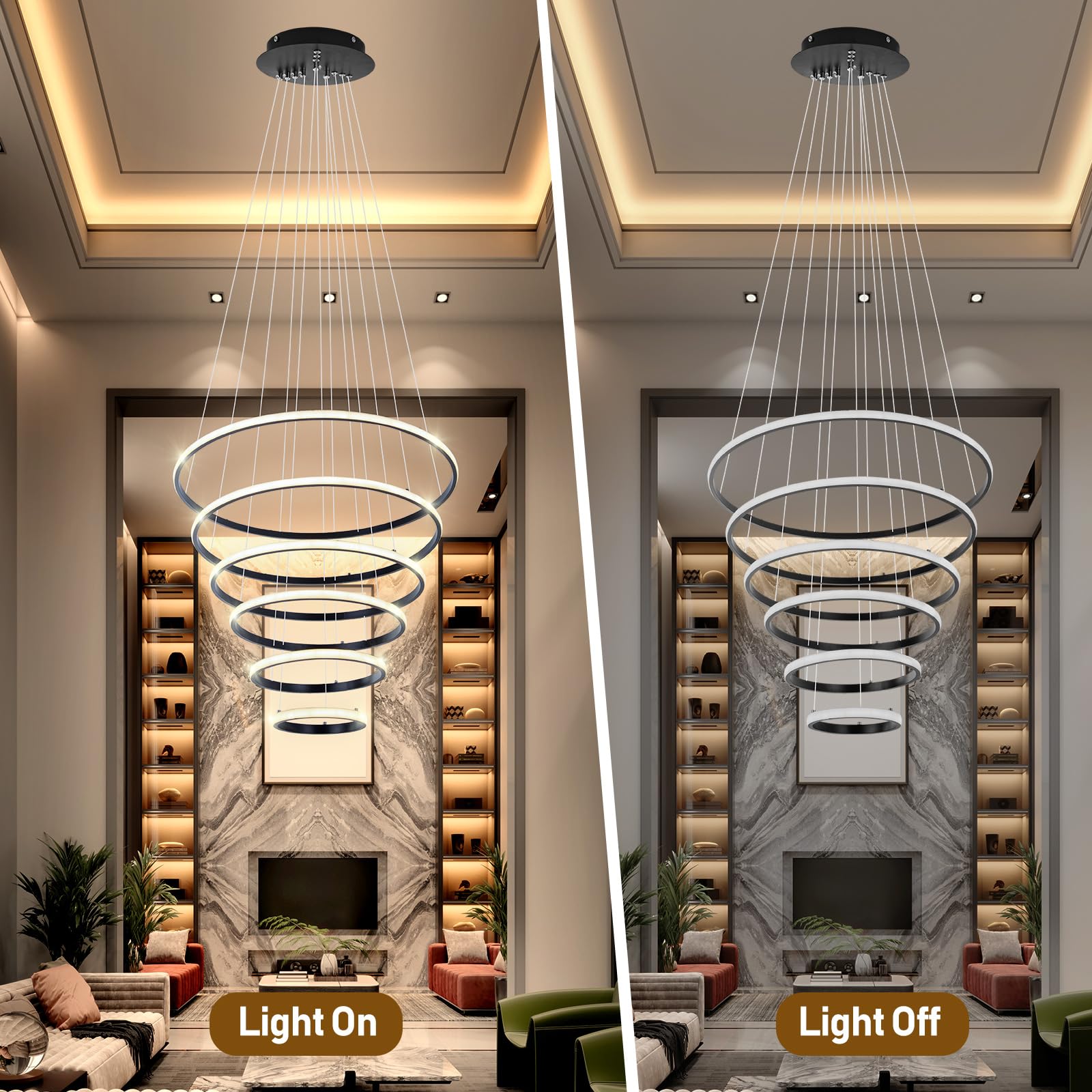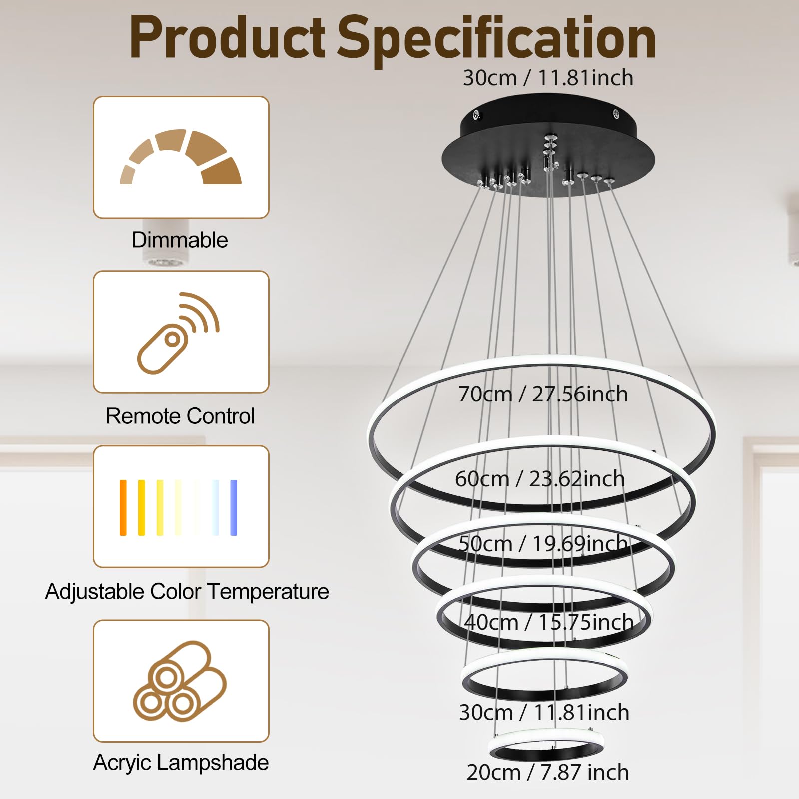 6 Ring Chandelier for High Ceiling with Remote Control, Black LED Chandelier Brightness