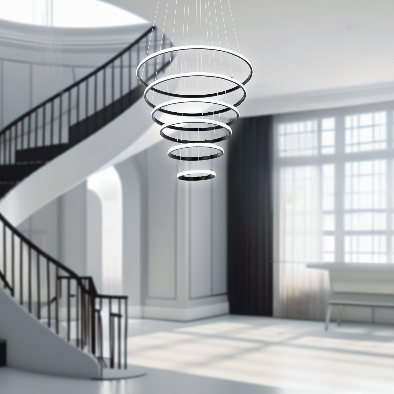- Sleek and energy-efficient, AstroLuominate Ring LED chandelier features 6 rings that can be adjusted for various scenes. Chandelier for high ceiling offers soft, glare-free illumination, adding a touch of fashion and spatial depth to any room.