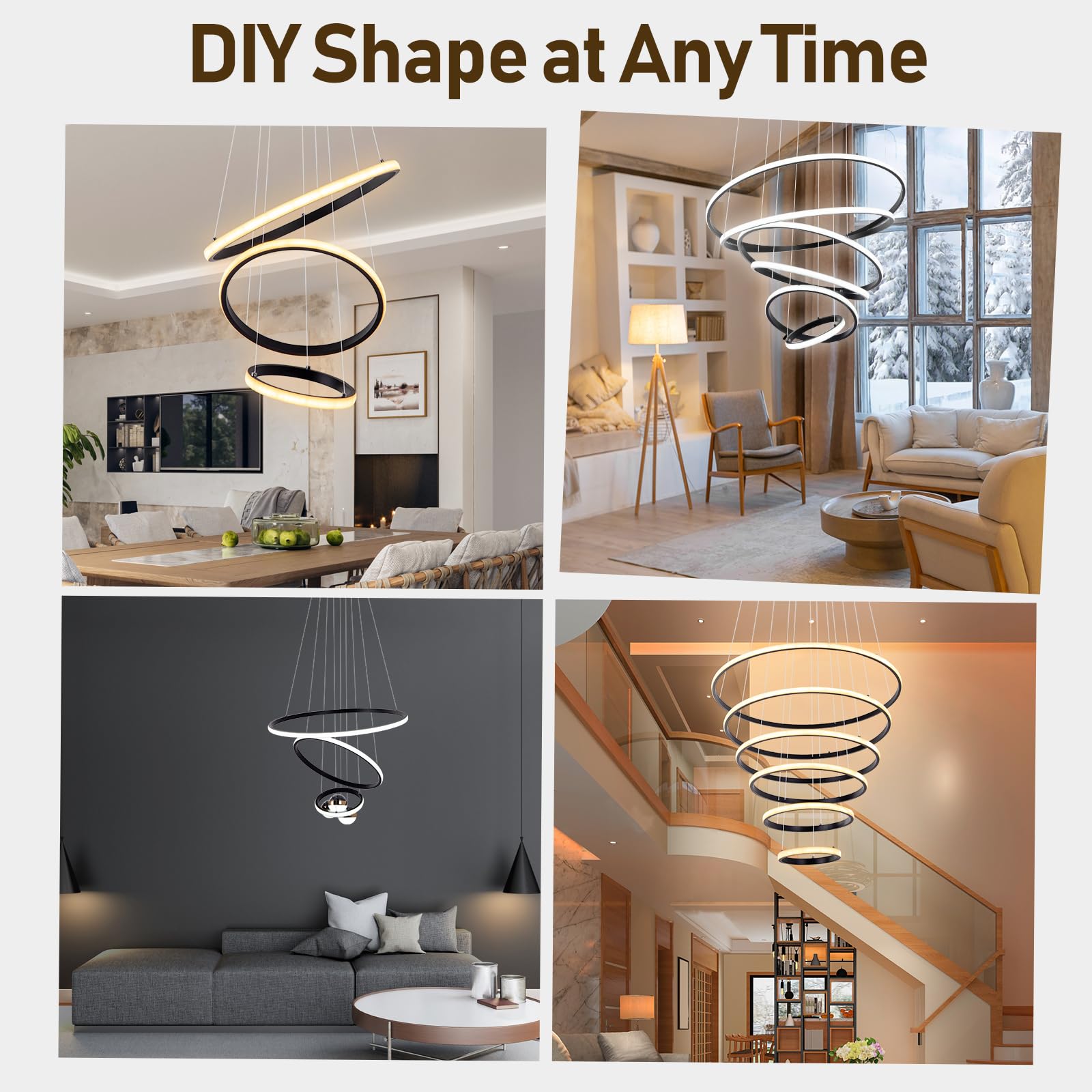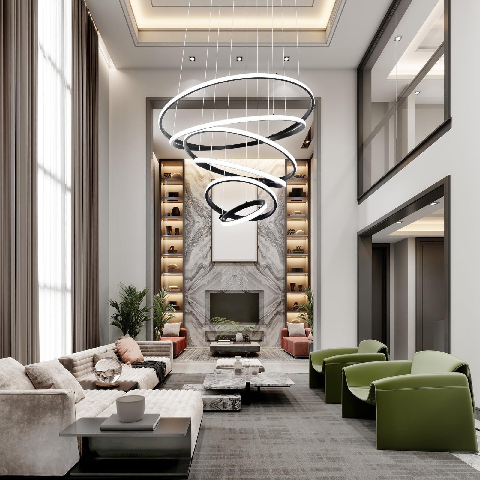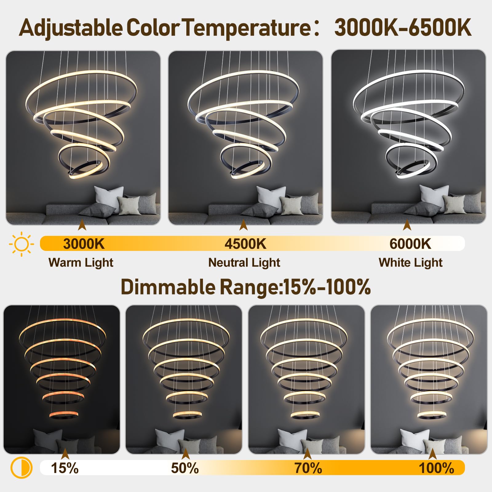- The high ceiling chandelier equipped with stepless adjustment, the color temperature can be changed from 3000K to 6500K, and the brightness can vary from 15% to 100%. Whether it's a romantic dinner, a lively gathering, or a relaxing evening, this ring chandelier puts personalised lighting at your fingertips, making any room feel just right.