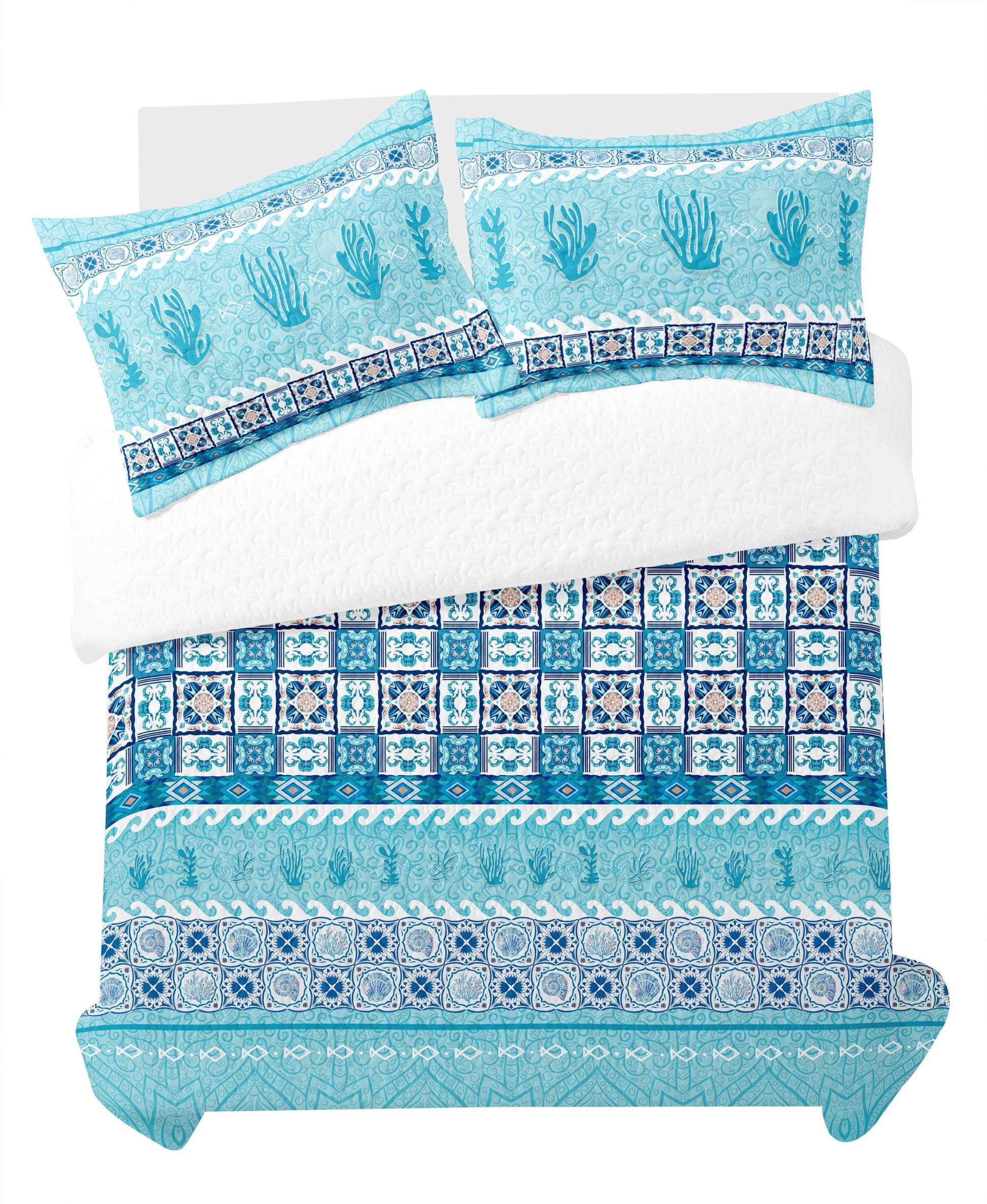 3 Piece Blue Coastal Quilt Sets Queen Size Microfiber Comforter Bedspread