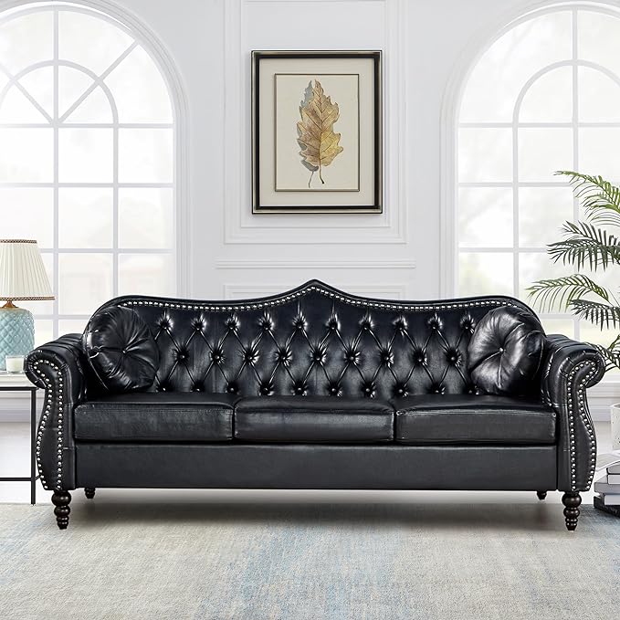 Leather Sofa 3 Seater Couch, Large Sofa Furniture Roll Arm Classic Tufted Chesterfield