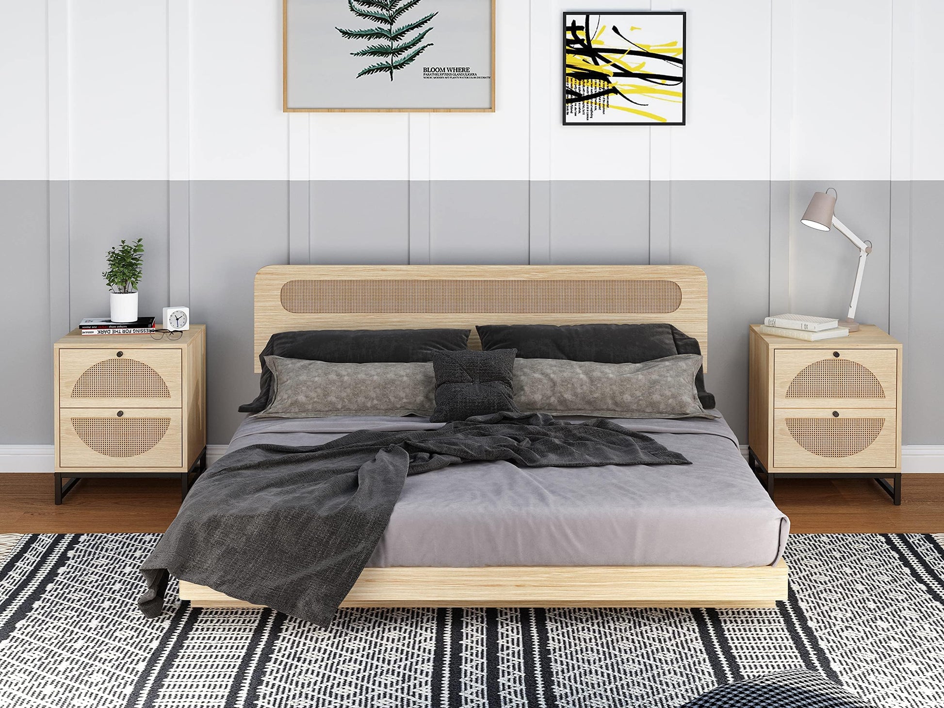 Rattan Nightstand Set of 2,Wood Bedside Table Set of 2 with 2 Drawers