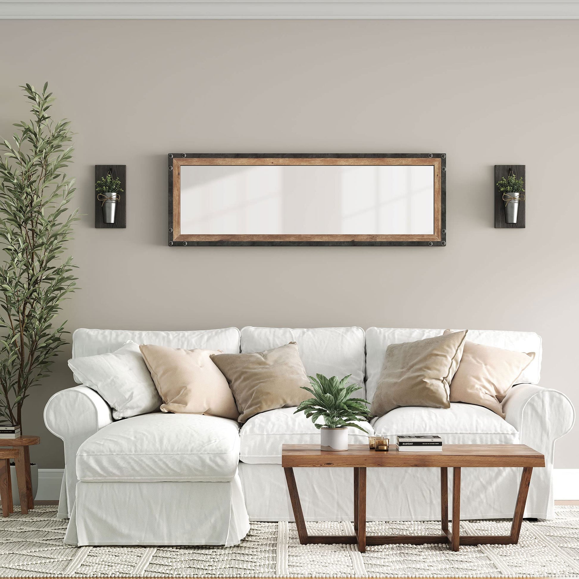 - Rustic Wood and Metal Frame - This rustic wood mirror will add some farmhouse decor charm to your home wall decor. Distressed large mirror with a reclaimed wood mirror feel that's durable for high-traffic areas.