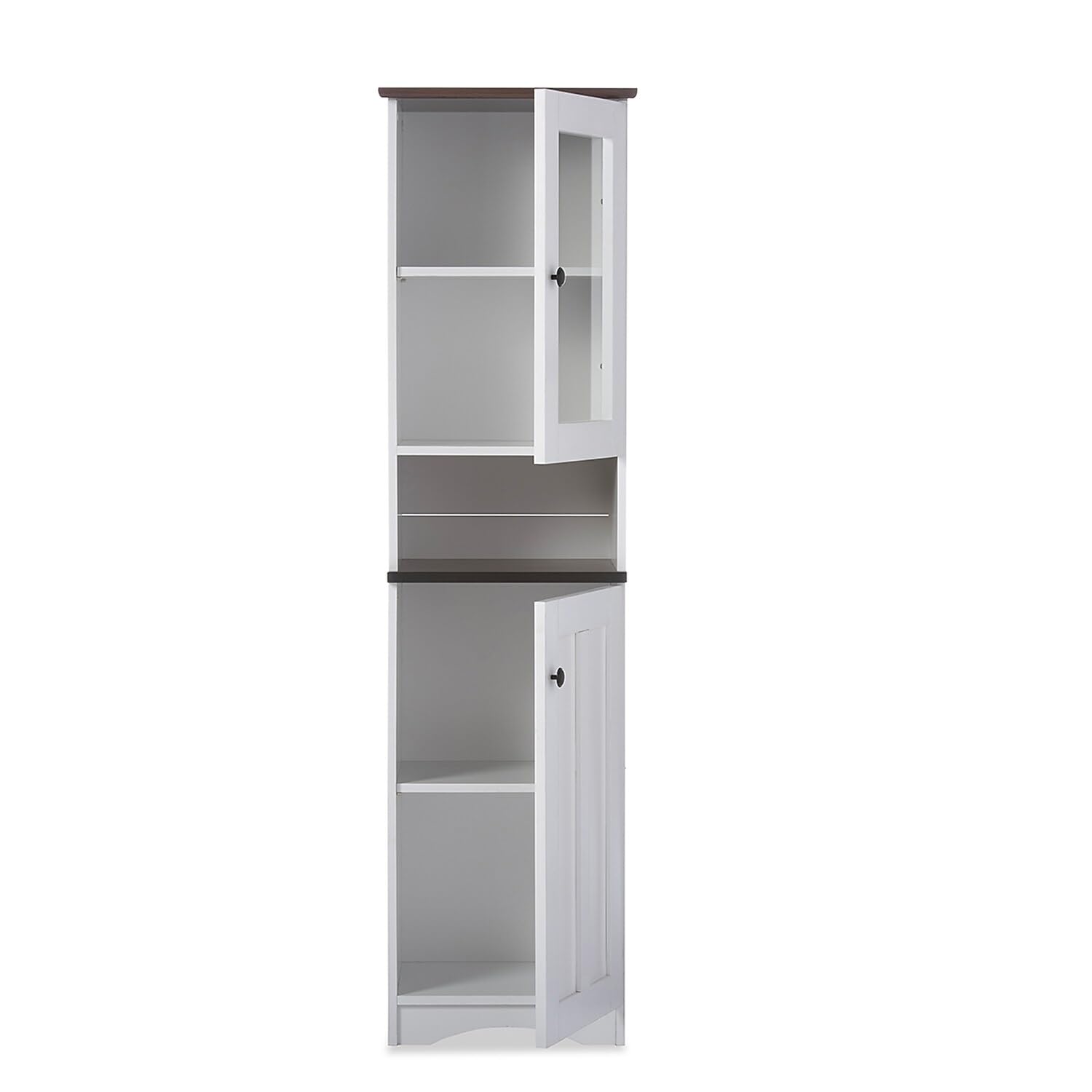 - Storage capacity: two upper shelves with glass door, one open middle shelf and two lower shelves with MDF door