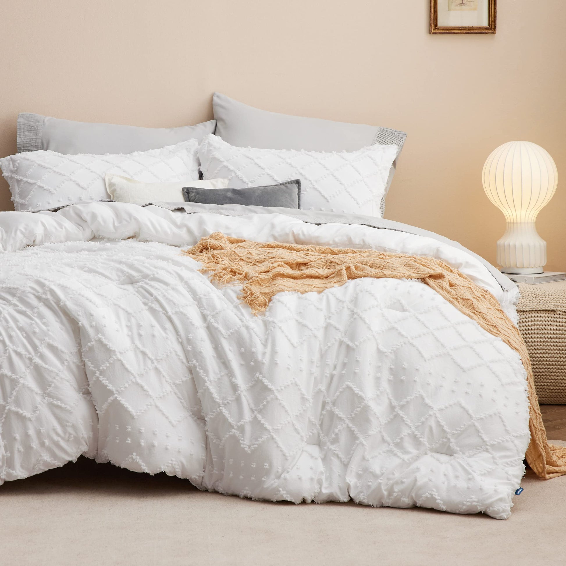Boho Comforter Set - White Tufted Shabby Chic Bedding Comforter Set