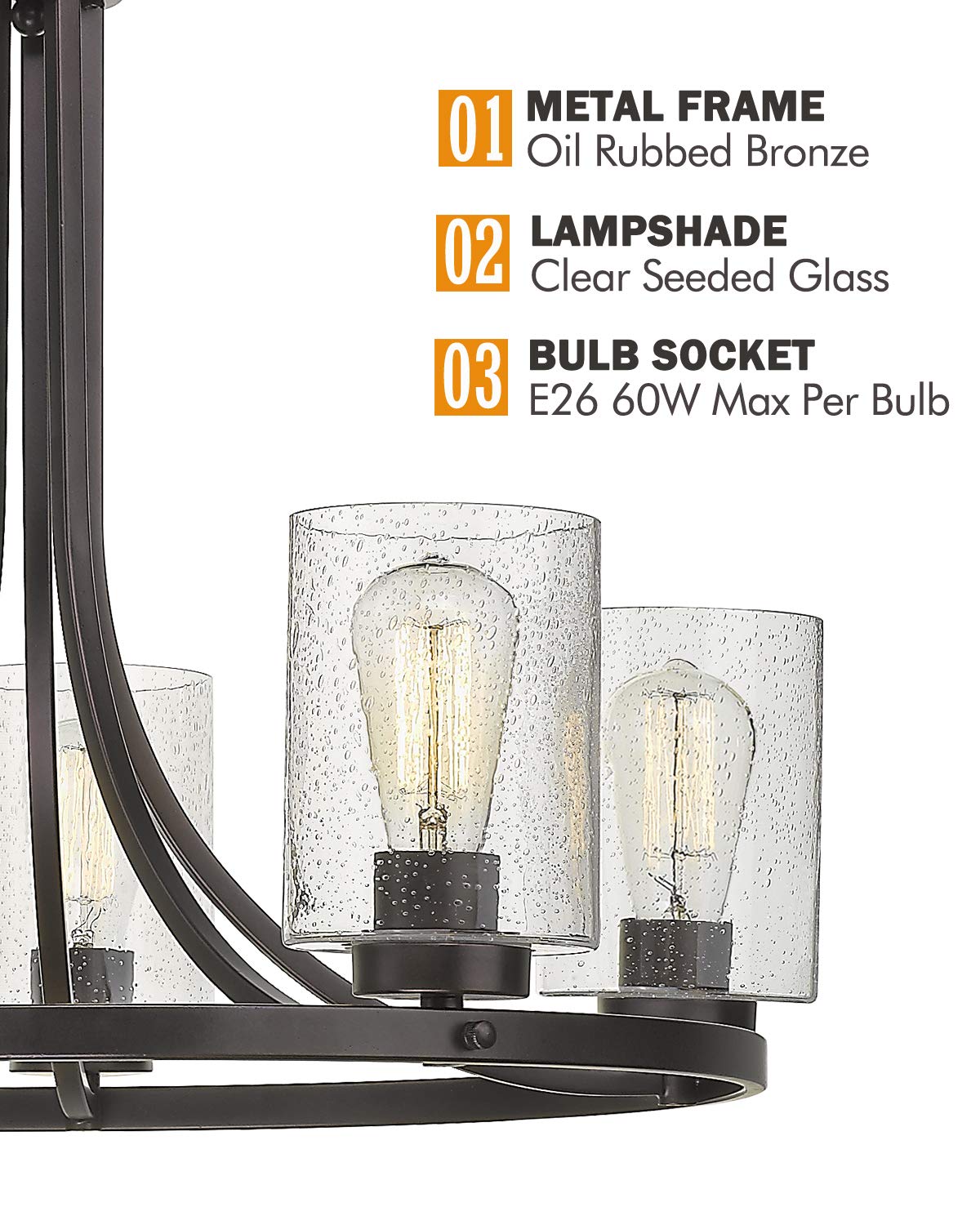 - Sleek, Contemporary Style Chandelier: Highlighted by its wagon wheel shape and stunning oil rubbed bronze finish, complemented by clear glass, this chandelier brings a vintage mid-century contemporary look to your home. It creates a warm, welcoming glow in the entryway or adds elegance to your dining room for an upcoming dinner party, serving as an eye-catching centerpiece.