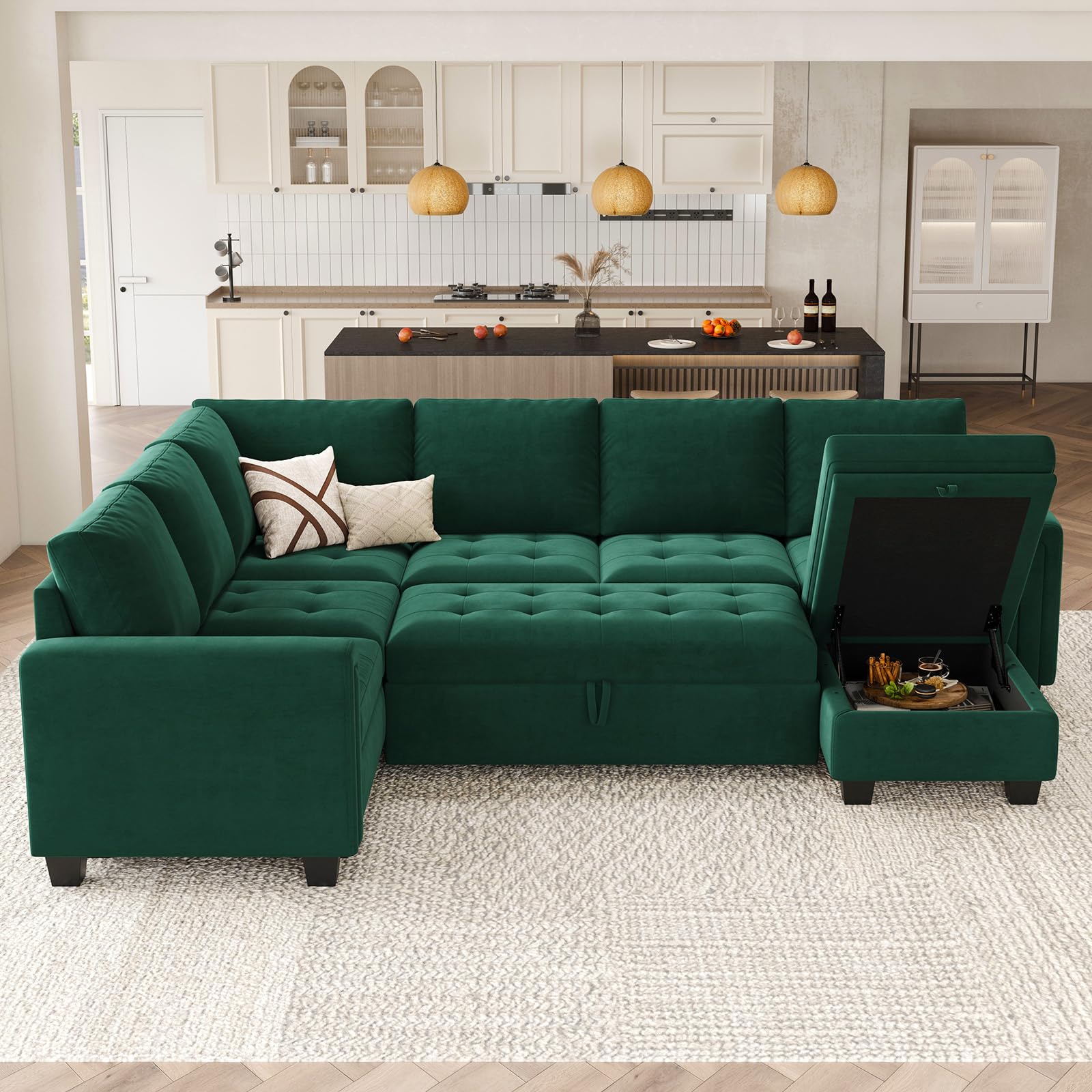 - The innovative 'pull out sleeper sectional module' transforms the modular u shaped sofa from a daily seating area into a comfortable bed for guests or an ideal spot for movie nights. This dual functionality makes it a space-saving and practical addition to any home.