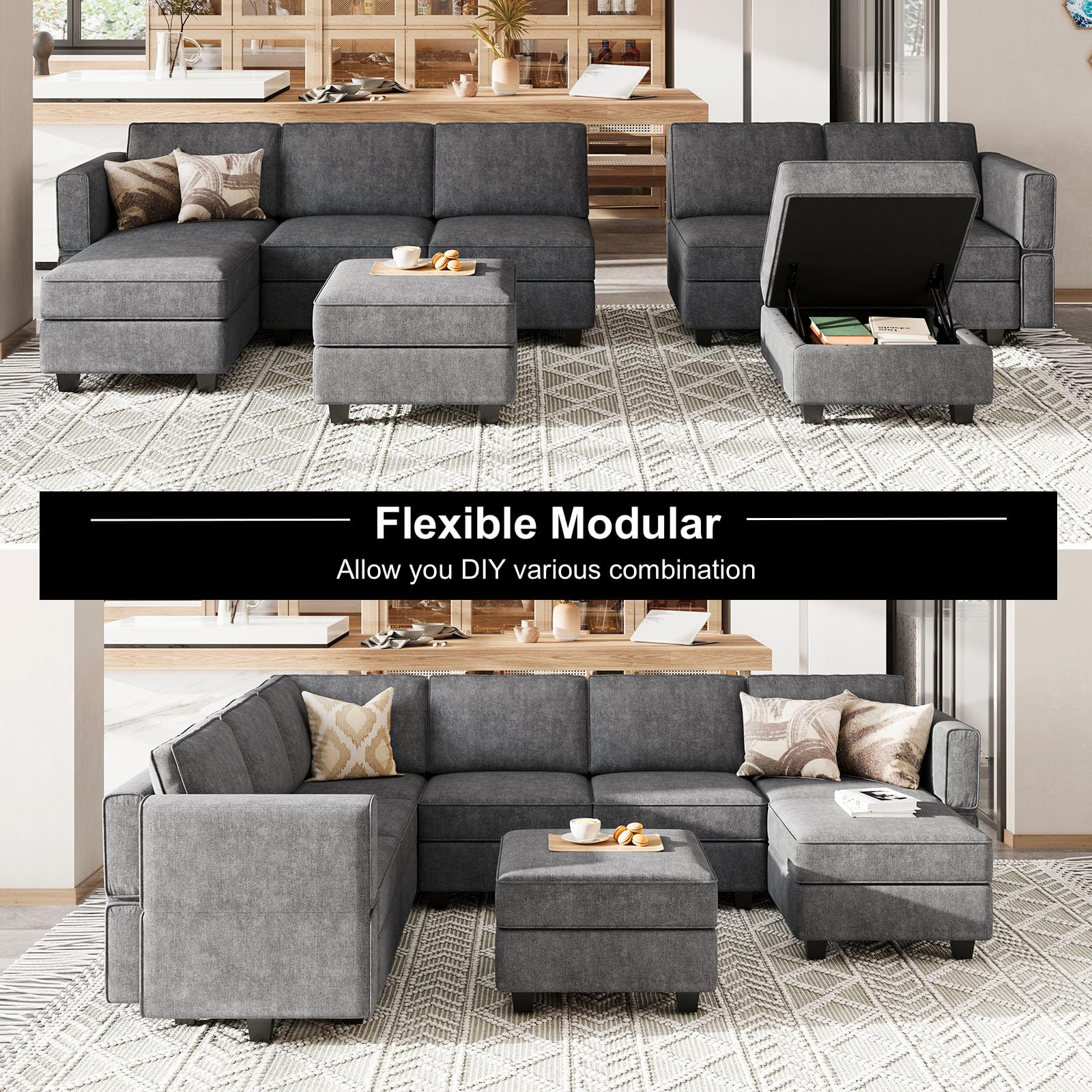 Belffin Modular Sectional Sofa Fabric U Shaped Couch Double Chaise Sectional Couch Convertible Ottoman Sofa with Storage Dark Grey