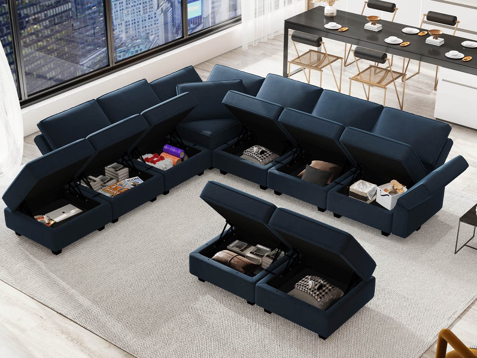 - Space-Saving Storage Seats The storage spaces of modular sofa are under each 8 seats for blankets, book, toy or other things that you want to store at hand. The modular sofa storage uses an air pressure bar which will slow the speed of opening and closing to prevent nip injury. Storage dimensions: 22.40''(L)*22.40''(W)"*5.70"(H).