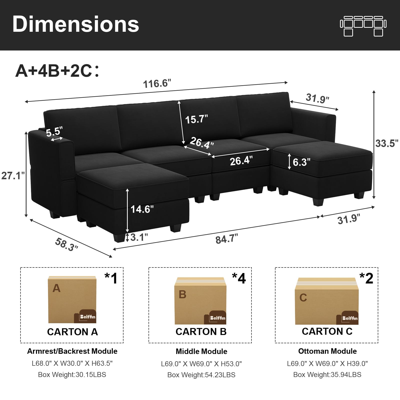 - Easy Assembly: With step-by-step instructions and the easy-assembly design concept, the assembly of U shape sectional sofa is a breeze. All you need to do is attach the legs and insert the backrest and armrests, convenient for you. Overall size: 116.60''(L)*58.30''(W)"*33.50"(H).7 boxes may arrive separately within a few days.