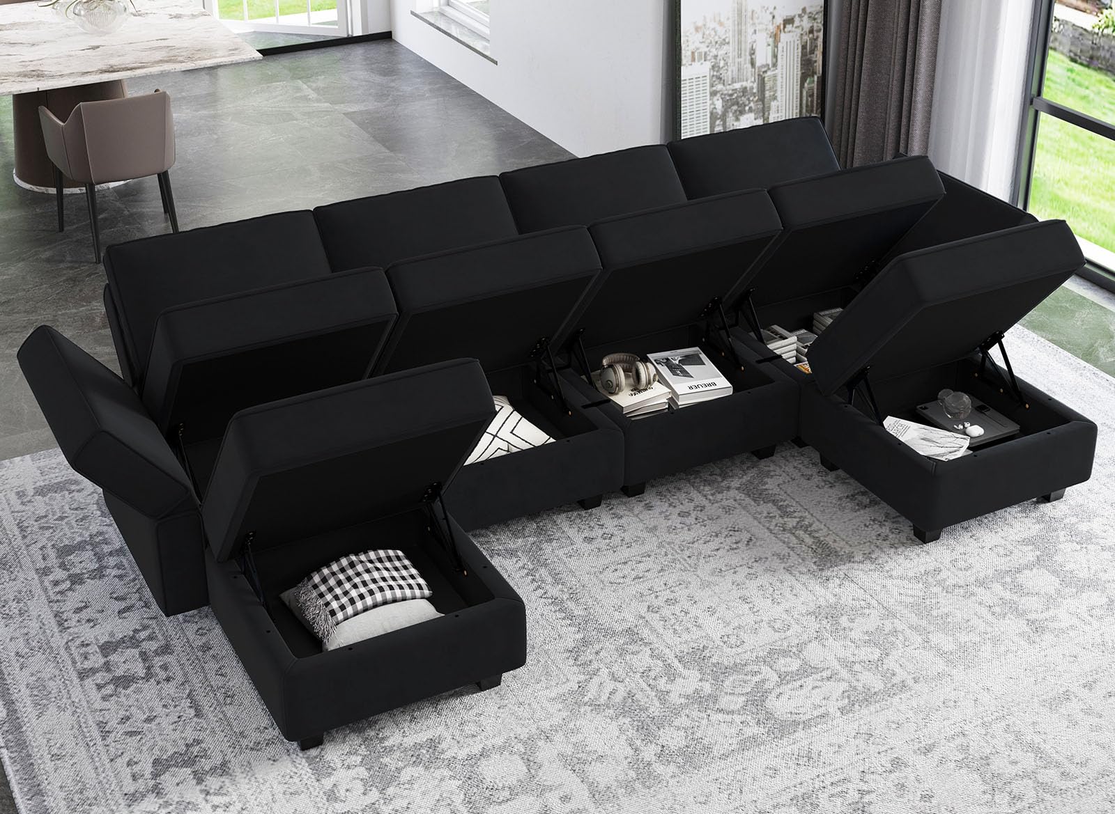 - Storage-friendly Seats: There are storage spaces under each seat of modular sectional 6-piece couch, and it is perfect for storing seasonal blanket, extra pillows and any living room accessories you want to easily put away. It is convenient for you to make the room neat and clean. Storage dimensions: 22.40''(L)*22.40''(W)"*5.70"(H)
