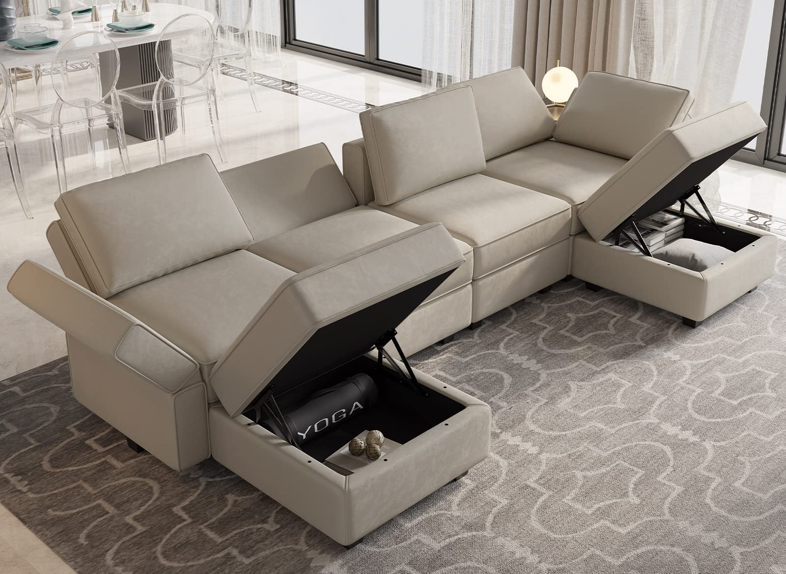 - Storage-friendly Seats: There are storage spaces under each seat of modular sectional 6-piece couch, and it is perfect for storing seasonal blanket, extra pillows and any living room accessories you want to easily put away. It is convenient for you to make the room neat and clean. Storage dimensions: 22.40''(L)*22.40''(W)"*5.70"(H)