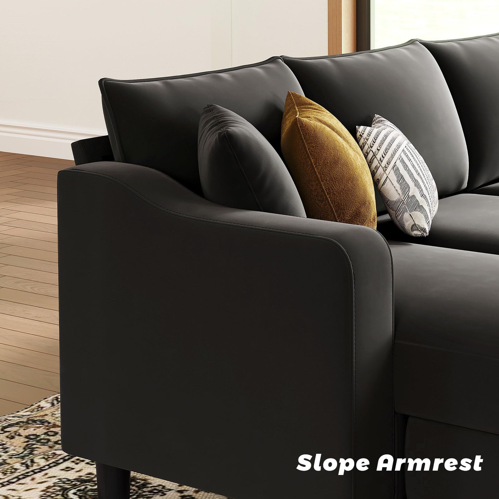 - With the smooth curved handrails and piping design, the u shaped couch highlights the modern and simple living style in its details. Sturdy solid wood frame, 100% velvet fabric, filled with high-quality sponge, make this sofa elegant and durable.