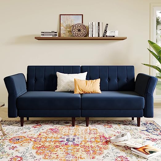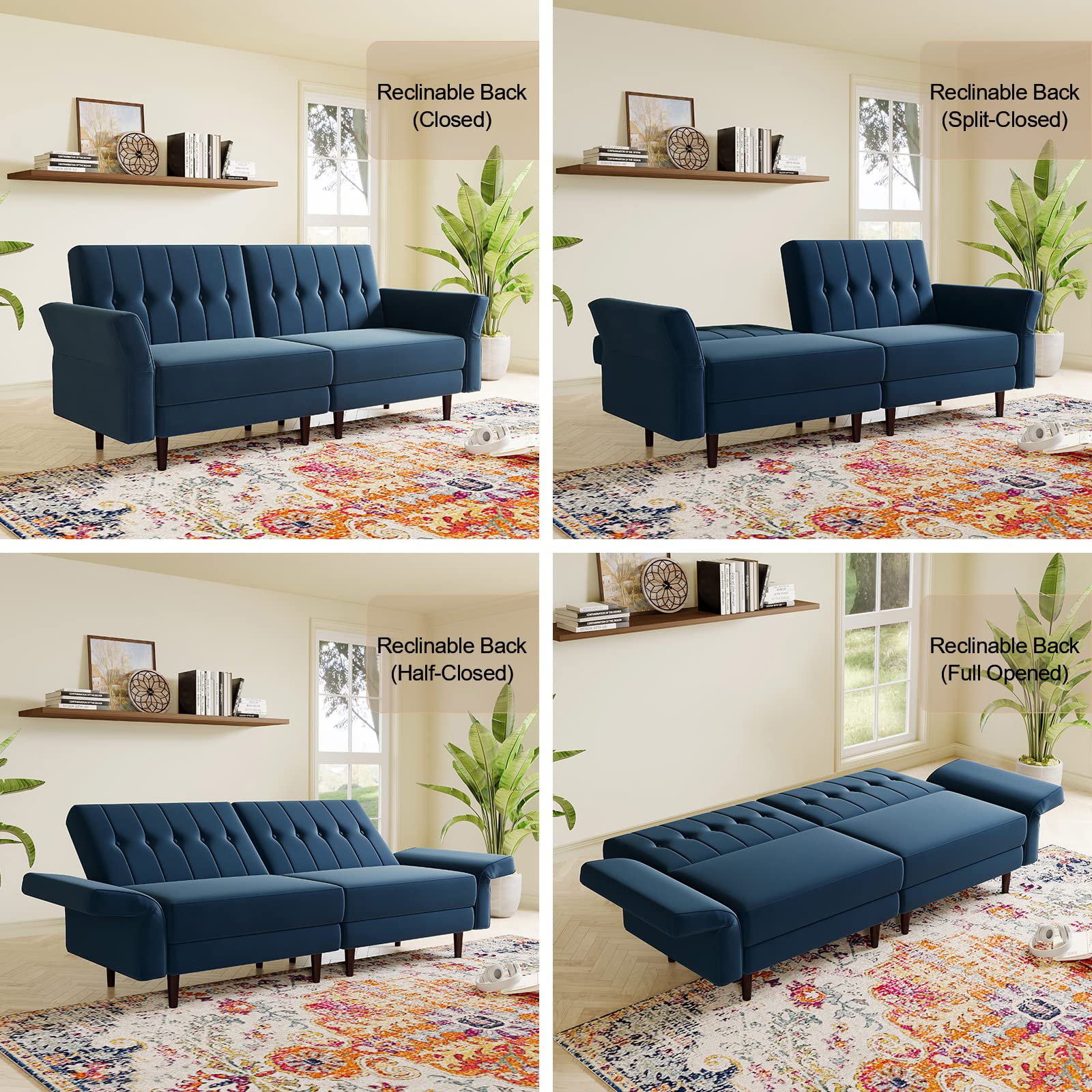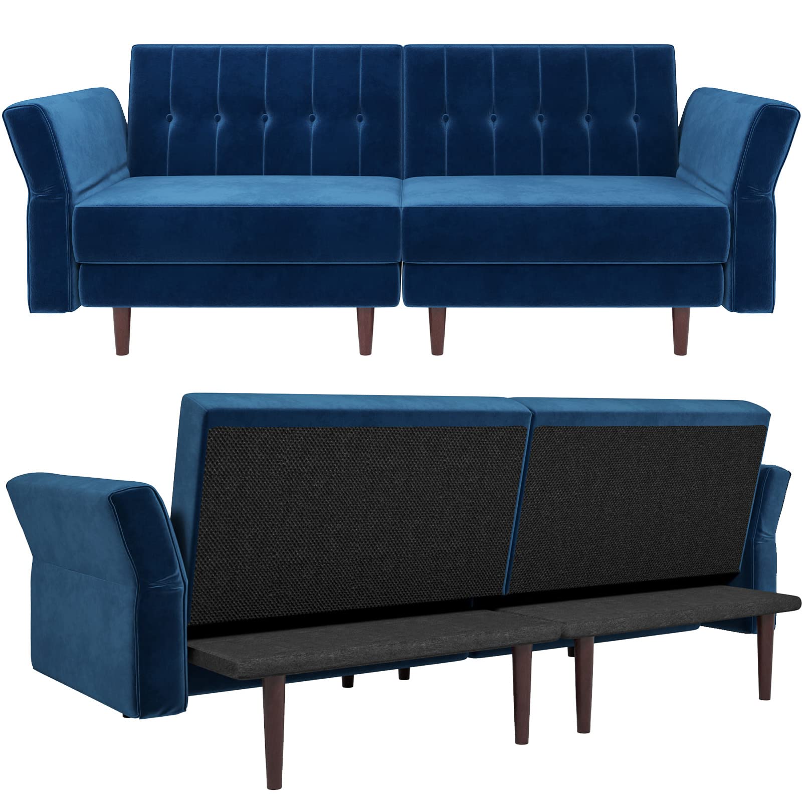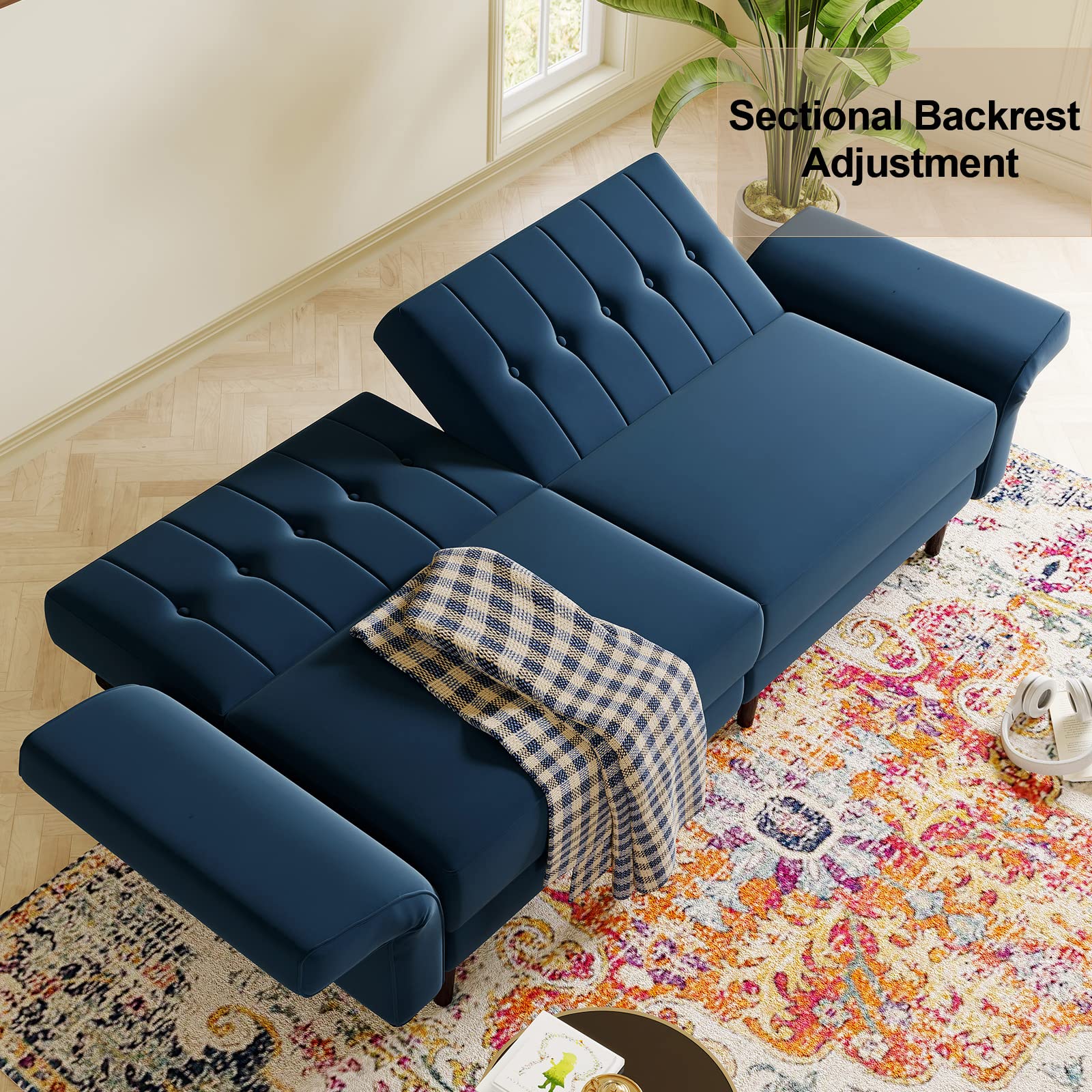 Velvet Convertible Futon Sofa Bed Memory Foam Futon Couch Sleeper Sofa Blue