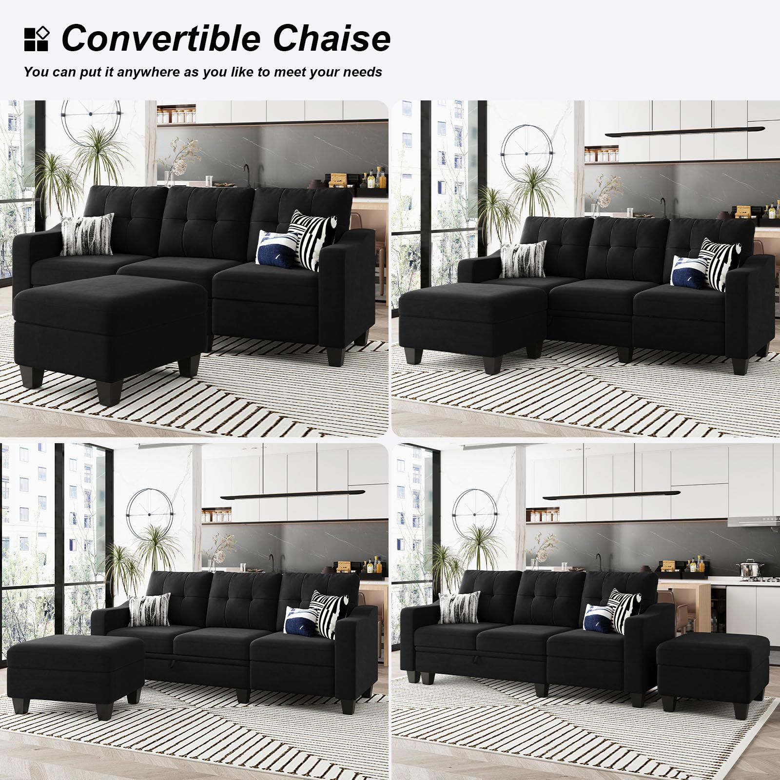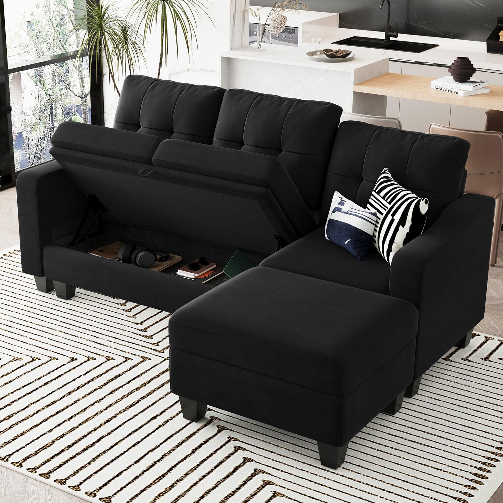 Velvet Sectional Couch with Storage, L Shaped Sofa with Chaise for Small Space, Black