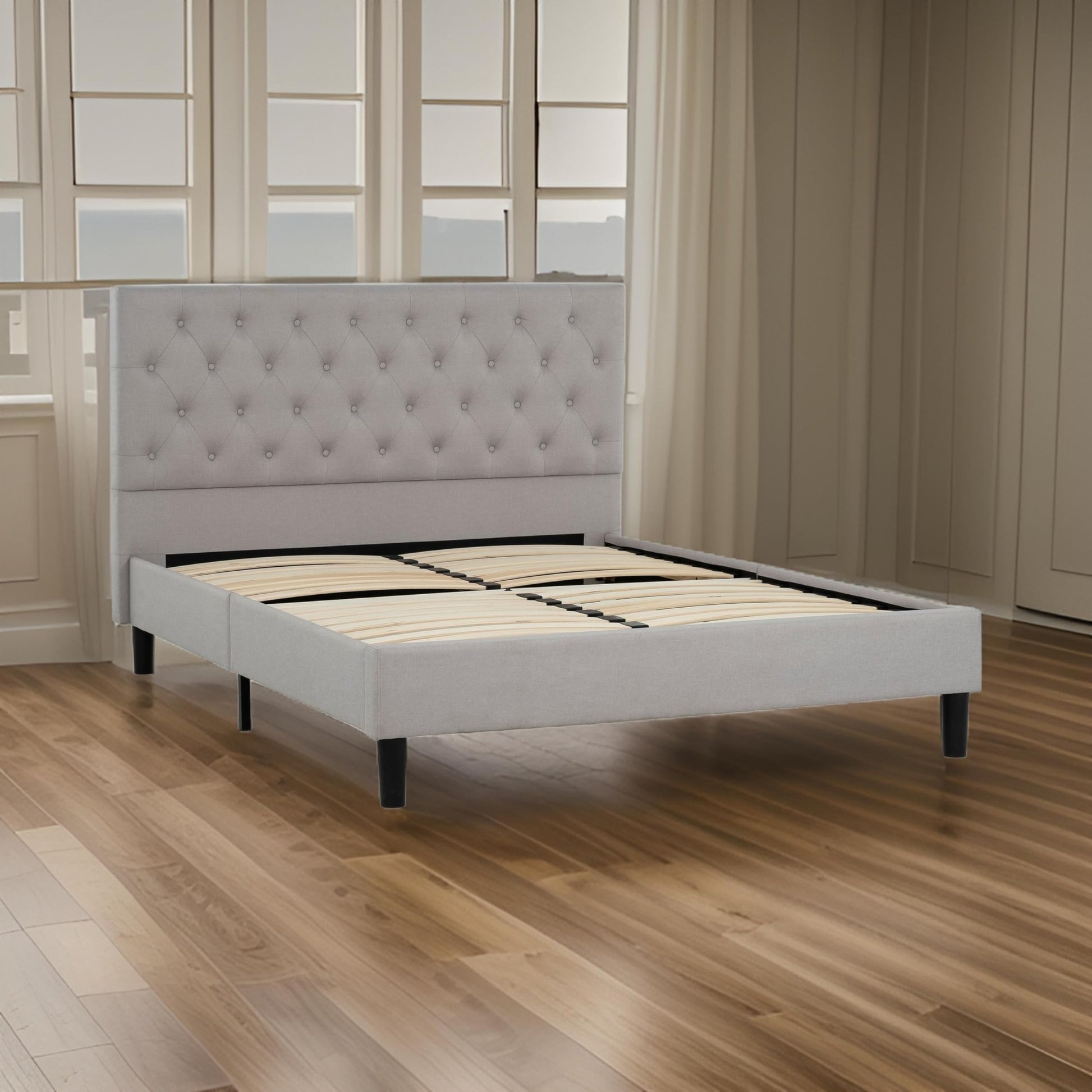 - Soft button tufted headboard with gray polyester upholstery with sleek low profile bed frame and slats included for sturdy support with small matte black rounded wood legs for stable and sturdy support