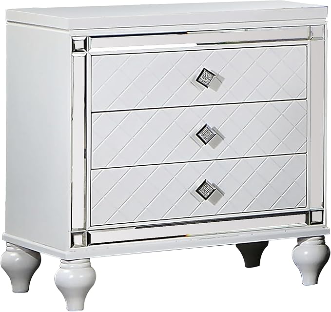 Benjara Calan 28 Inch Nightstand, 3 Drawers, Pebble Texture, Mirror Trim, White and Chrome