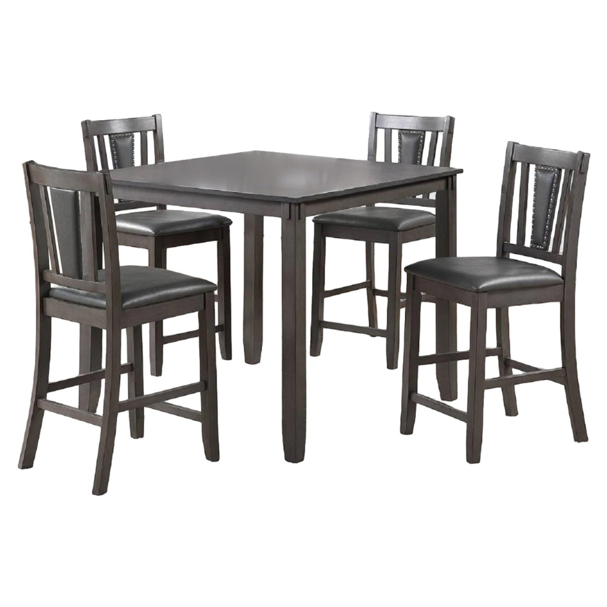 - Padded seats with soft dark gray faux leather upholstery and Dimensions: Table: 42L x 42W x 36H, Chairs: 18L x 21W x 41H, Seat height: 24, in inches