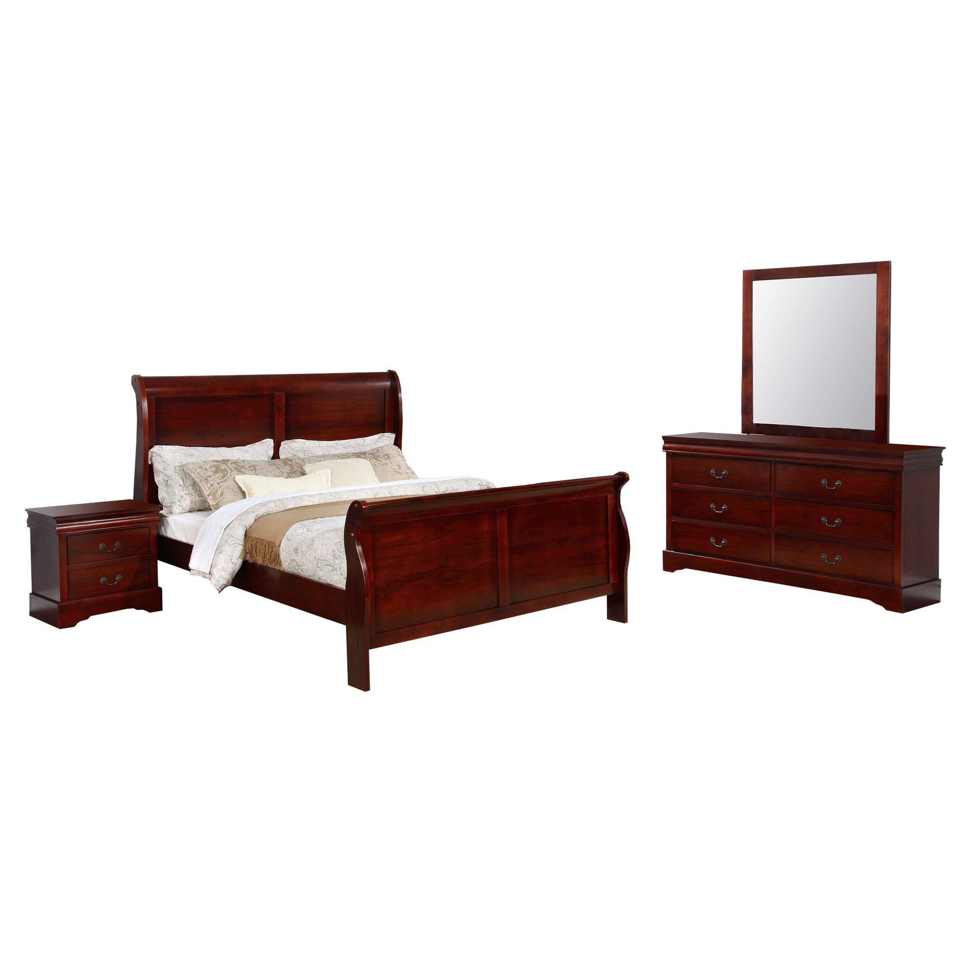 - Includes 1 Full Bed, 1 Dresser, 1 Mirror, 1 Nightstand