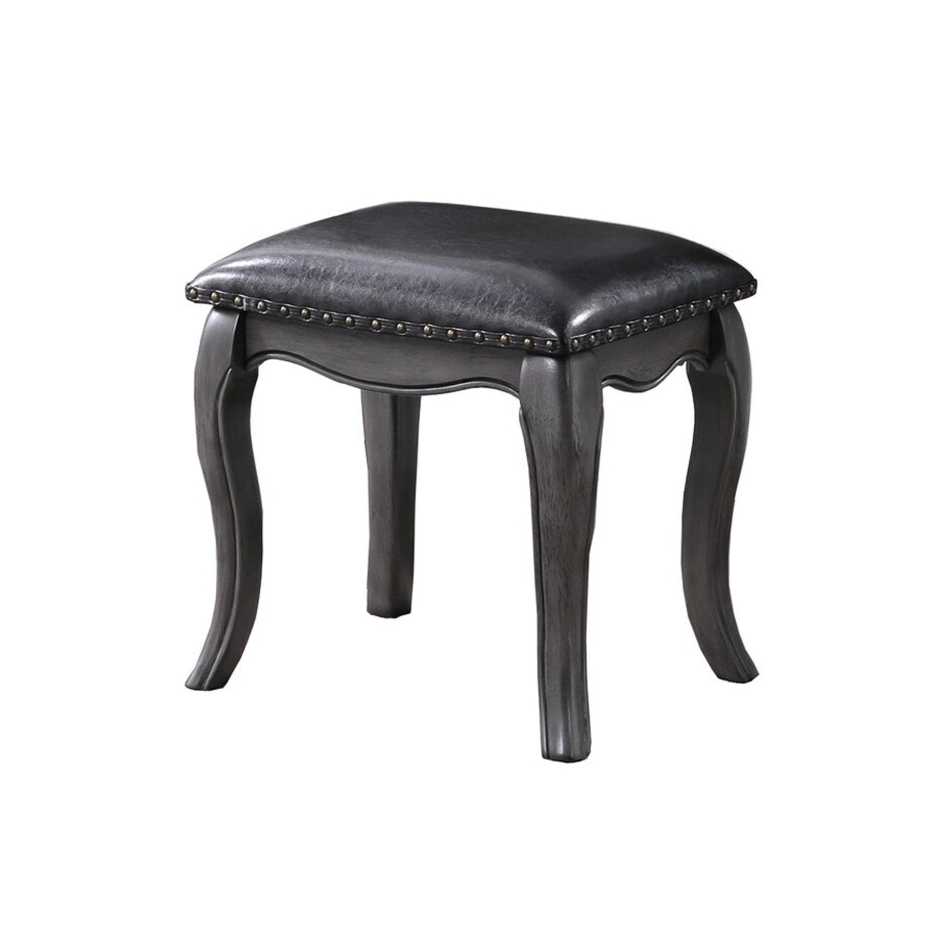 - Cushioned seat stool with soft gray faux leather upholstery and nailhead trim details