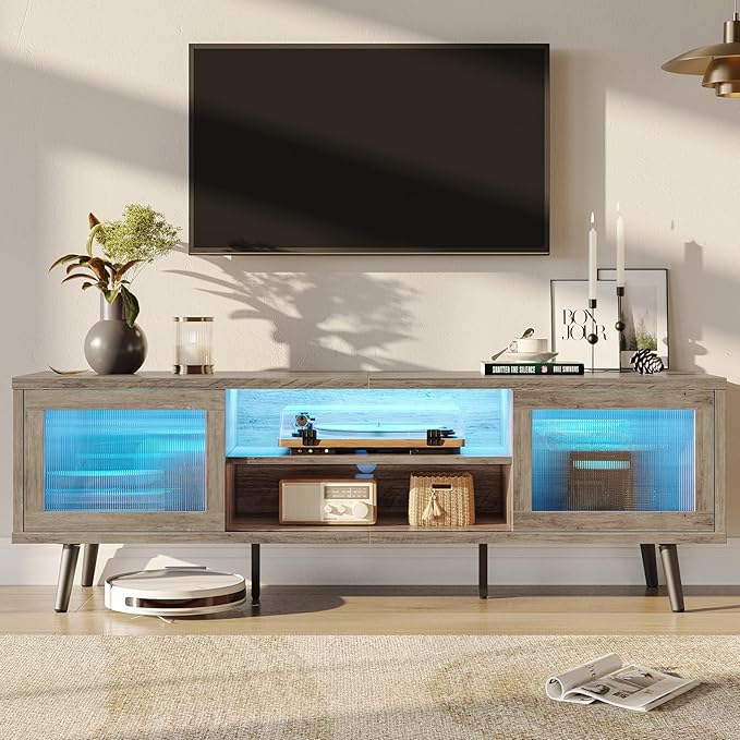 - The combination of wood finish and colorful LED lights, the collision of vintage and modern makes this TV stand more unique and charming. Acrylic fluted cabinet doors allow for better light transmission and privacy at the same time. This TV console is sure to be a beautiful addition to your living room and bedroom.