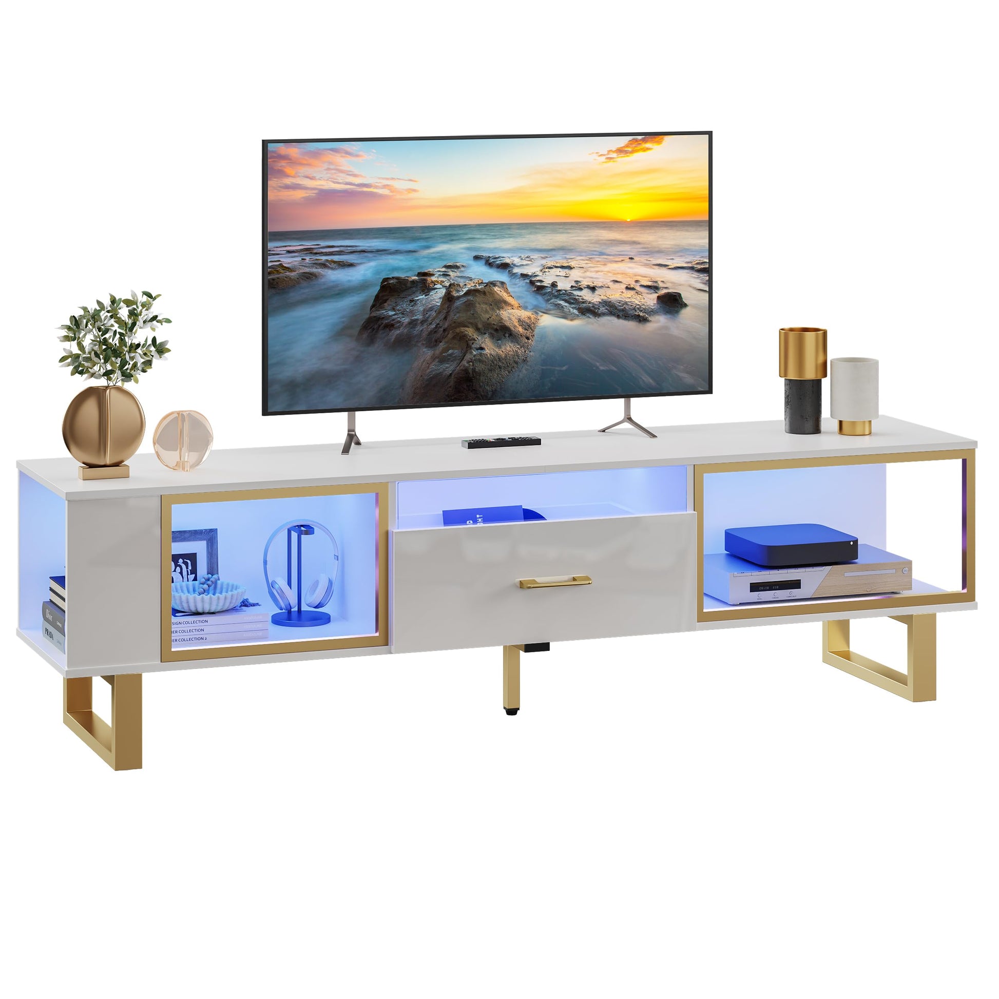 - Spacious Storage Space Bestier white and gold TV stand features half-glass drawer and two open storage places. Plenty of storage space for your functional TV table, you can put CDs, switch, remote controls, video games, books, entertainment accessories and more into the cabinet, keeping your home tidy and clean.