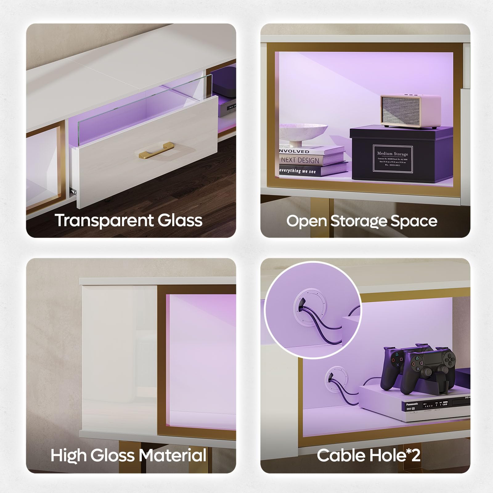 - Half-Glass Drawer Design The drawer features a unique glass inlay with a transparent glass setting that reflects different RGB lights, adding a unique design aesthetic and atmosphere to the entire TV console table. Cool transparent lighting will make your fun life more vibrant.