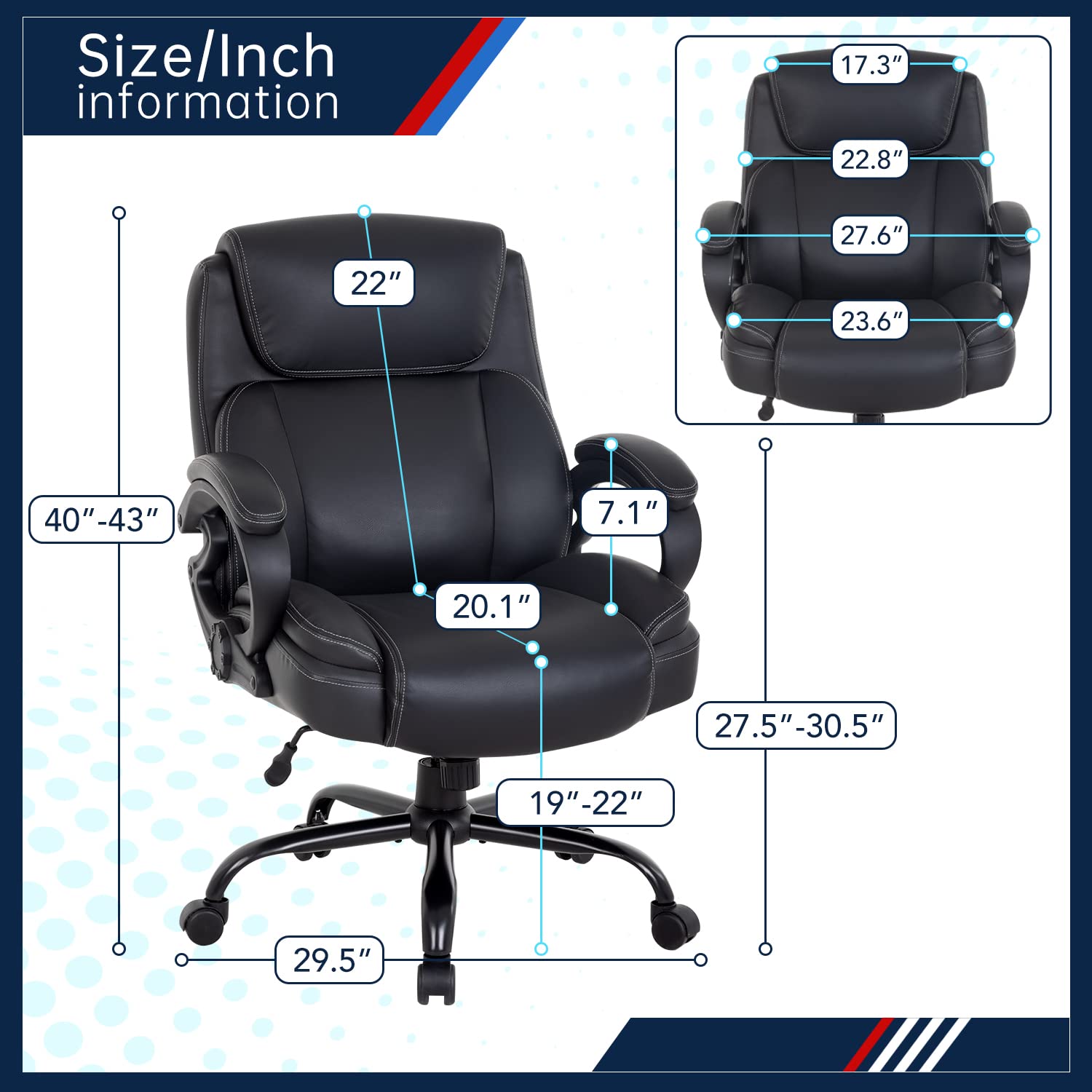 - Our big tall office chair have excellent breathable PU leather design, maintain the air flowing naturally in the executive chair seat area keep the sweat and back were not overheating.
