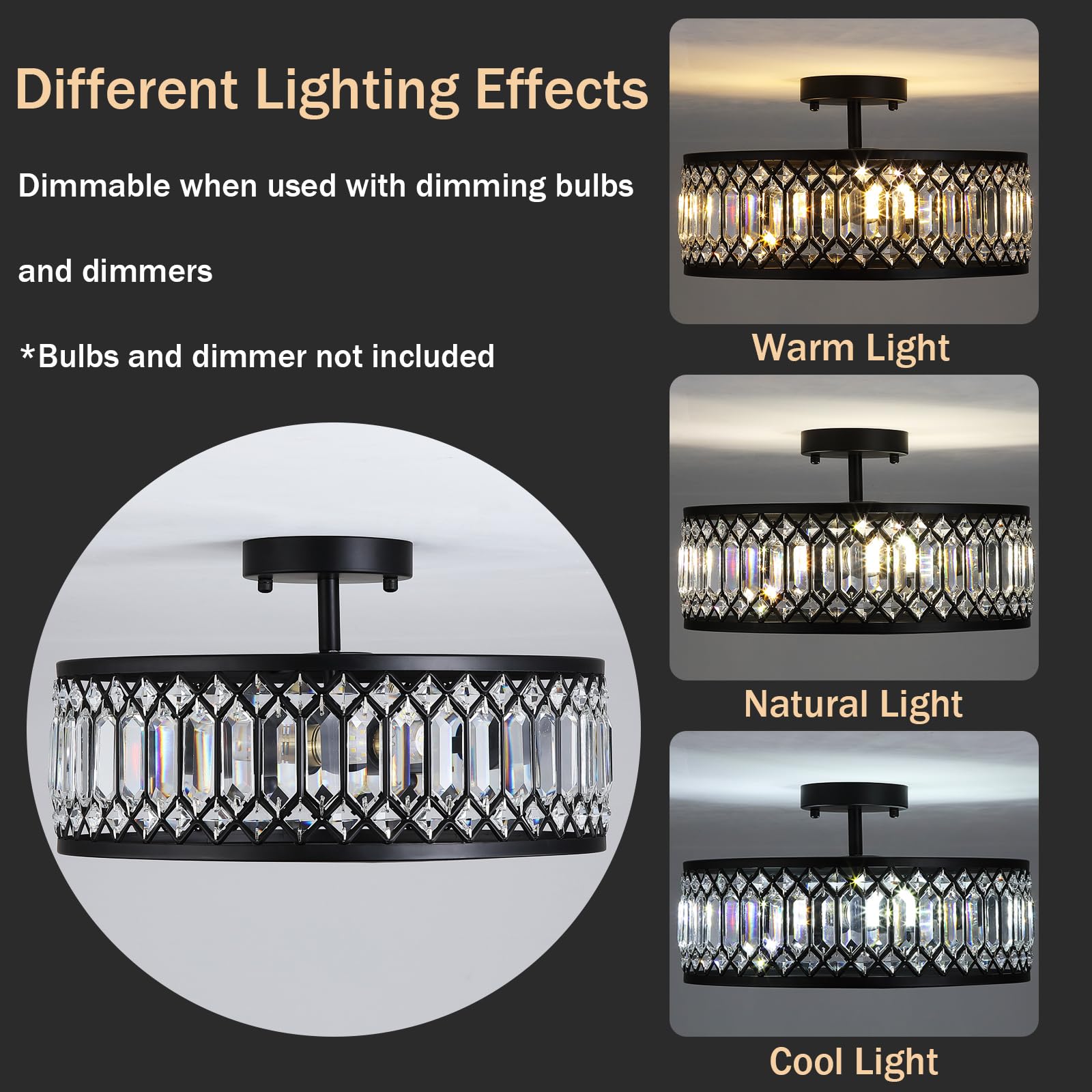 16" Black Crystal Ceiling Light - 3-Light Semi Flush Mount Chandelier