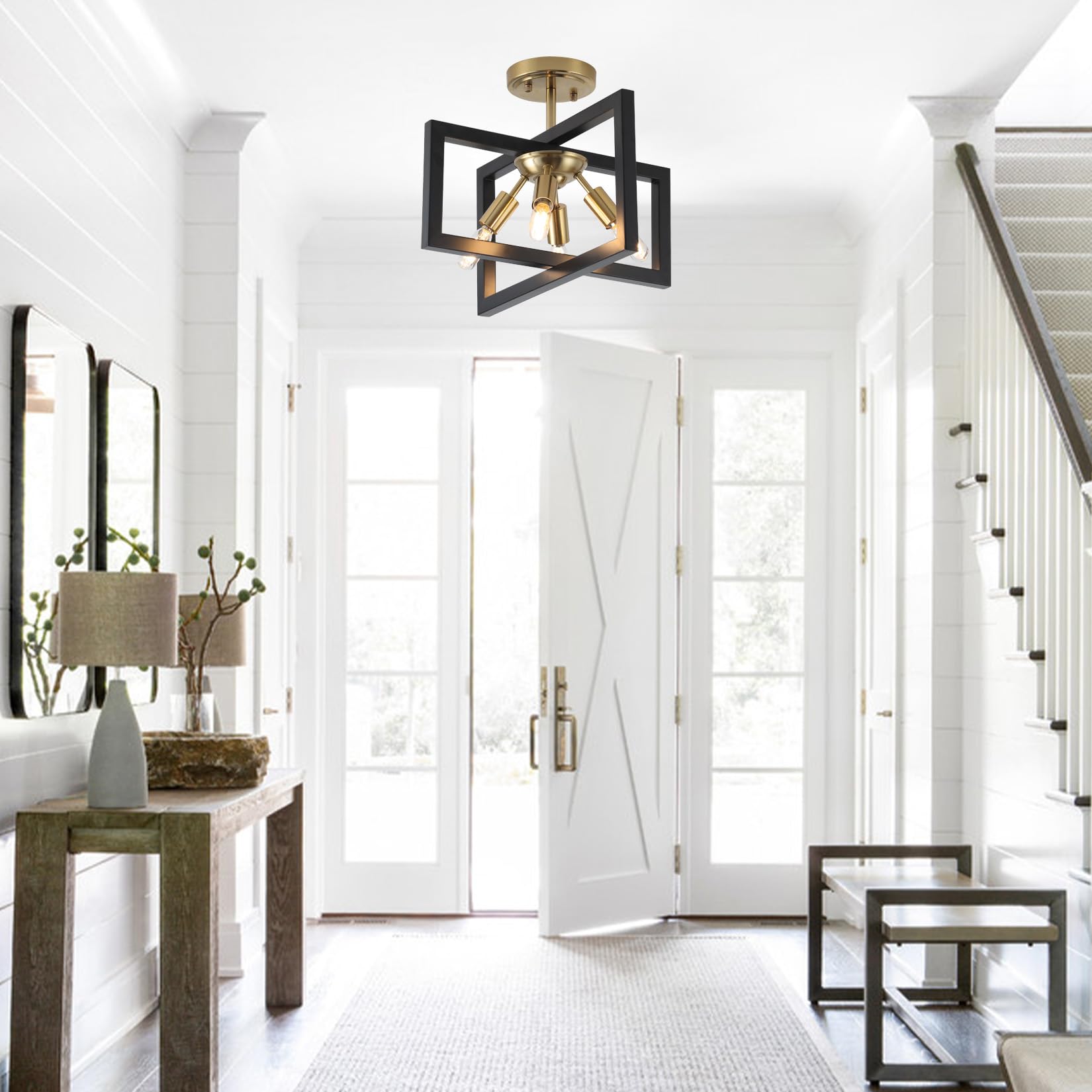 Elevate your interior with this striking black and gold semi-flush mount ceiling light that seamlessly blends modern sophistication with industrial charm. The four-light candelabra design creates ambient illumination while serving as a stunning focal point in any room.