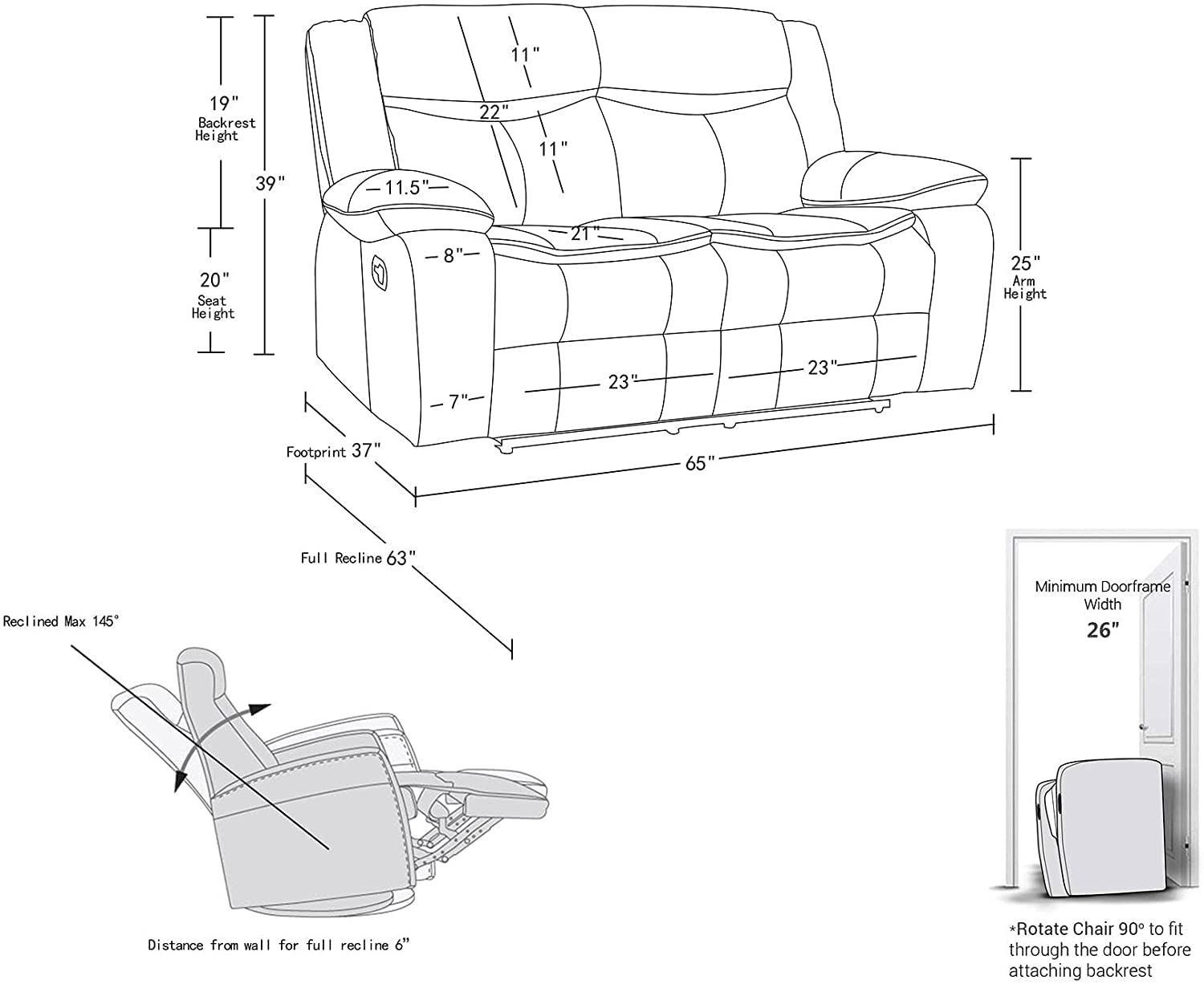 - Reclining Loveseat Measures 64" inches L x 36" inches W x 40" inches H and Weighs 152 lbs. Requires Home Assembly.