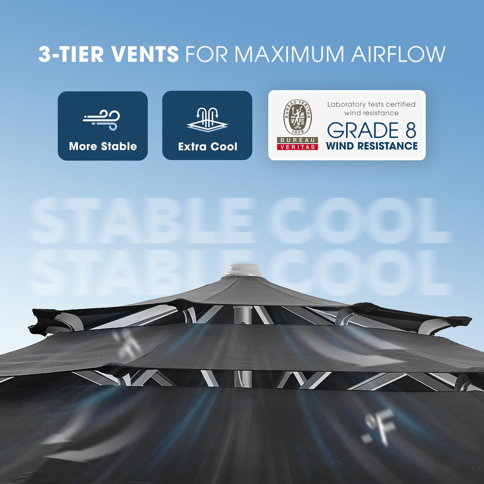 - 3-Tier Air Vents for Stability and Comfort: The patio umbrella features a 3-tier air vents design that allows for optimal wind circulation. This increases the stability of the umbrella and also helps keep the area underneath the umbrella cooler and more comfortable during hot summer days. Stay cool and relaxed while enjoying the outdoors with this unique feature.