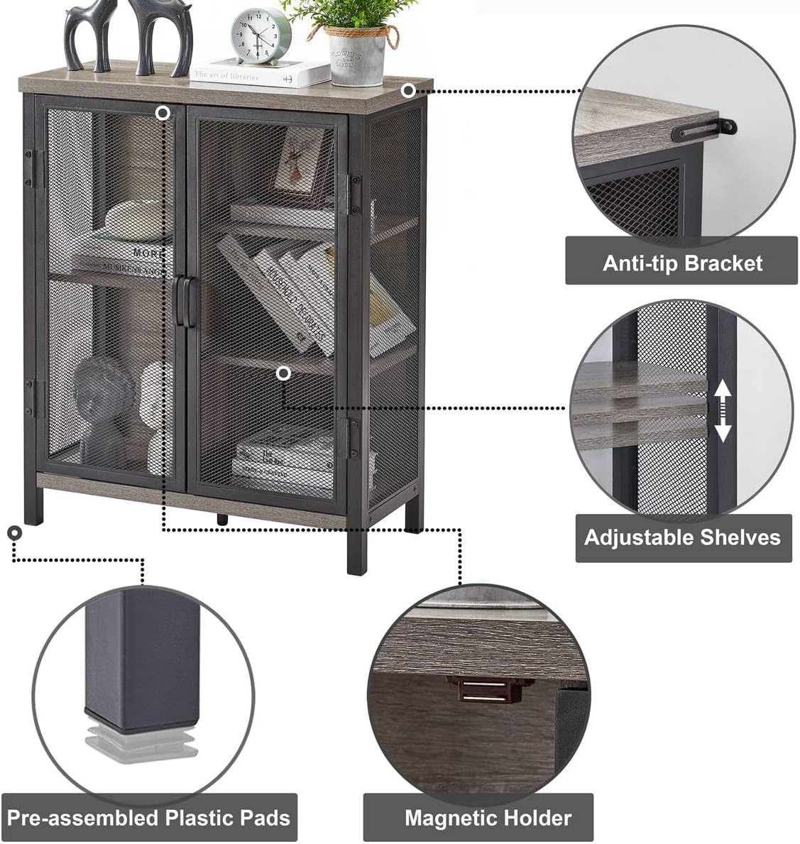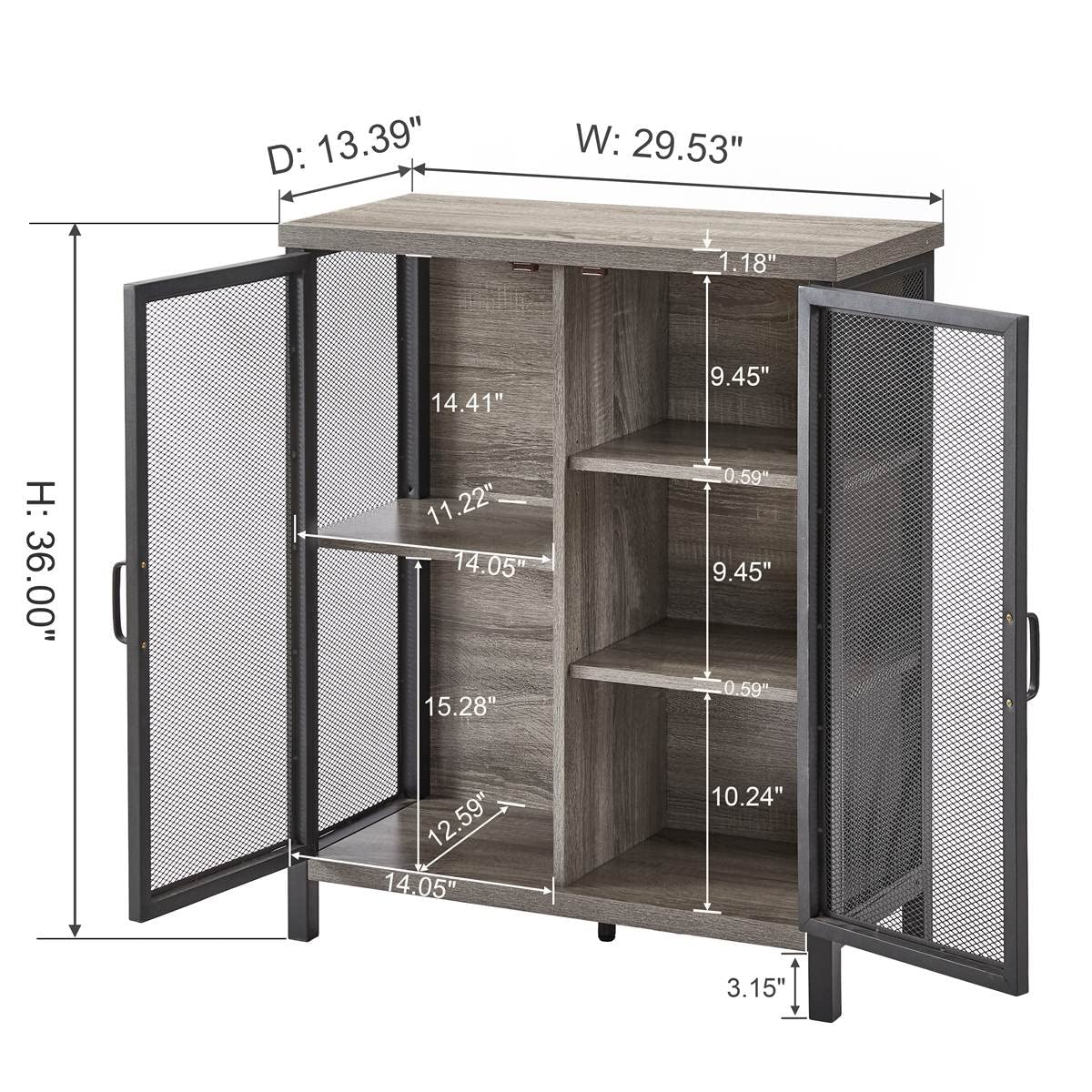 - Dimensions and Material: 29.50"W x 13.39"D x 36.00"H. Crafted from high-quality MDF board with dark grey oak wood grain finished that adds industrial touch to your home. We also use powder coating to seal up the steel and the metal of this storage cabinet won’t rust over time.