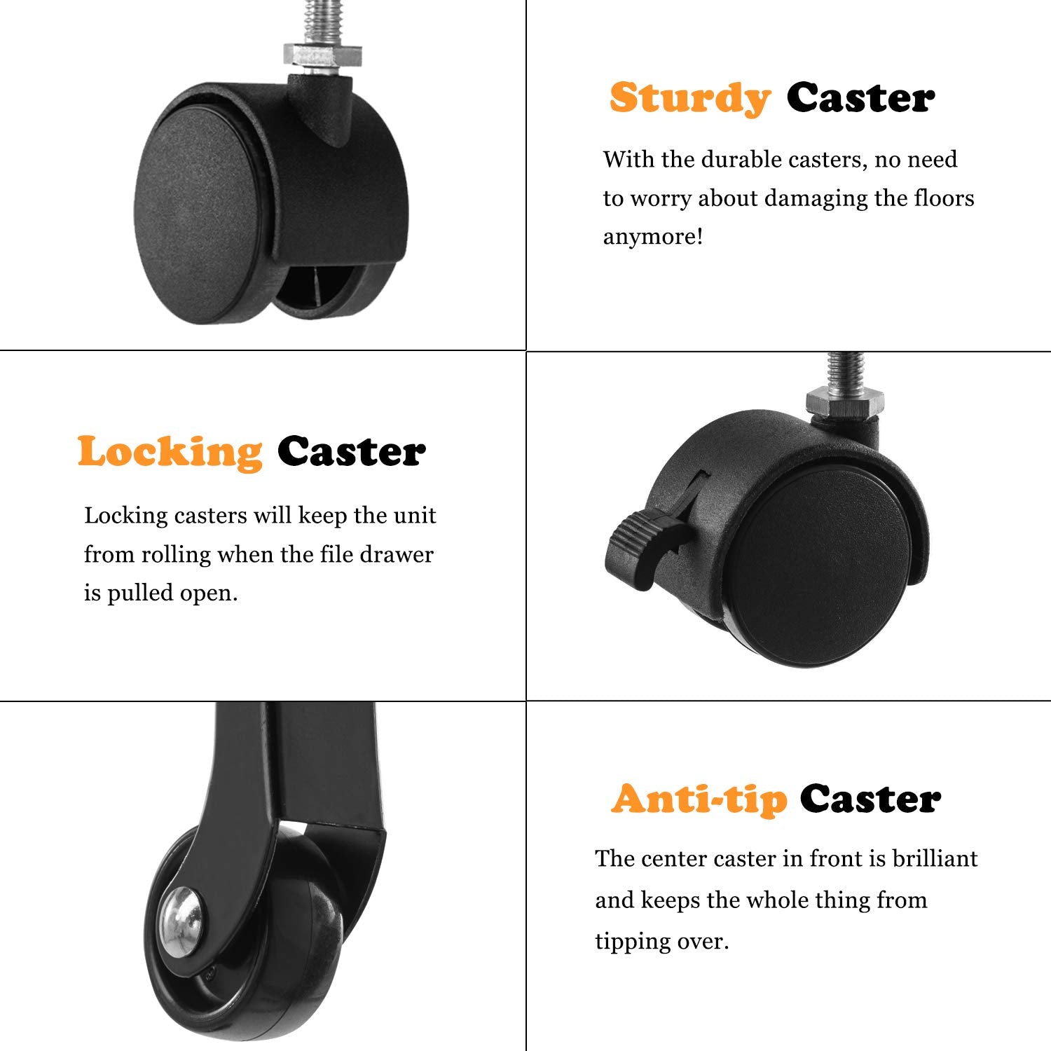 - Bonno 3 drawer file cabinet with lock is fully assembled (except the casters). 4 casters for easy mobility (2 are lockable for stability), while the 5th center caster at the bottom-front helps keep the file cabinet from tipping over