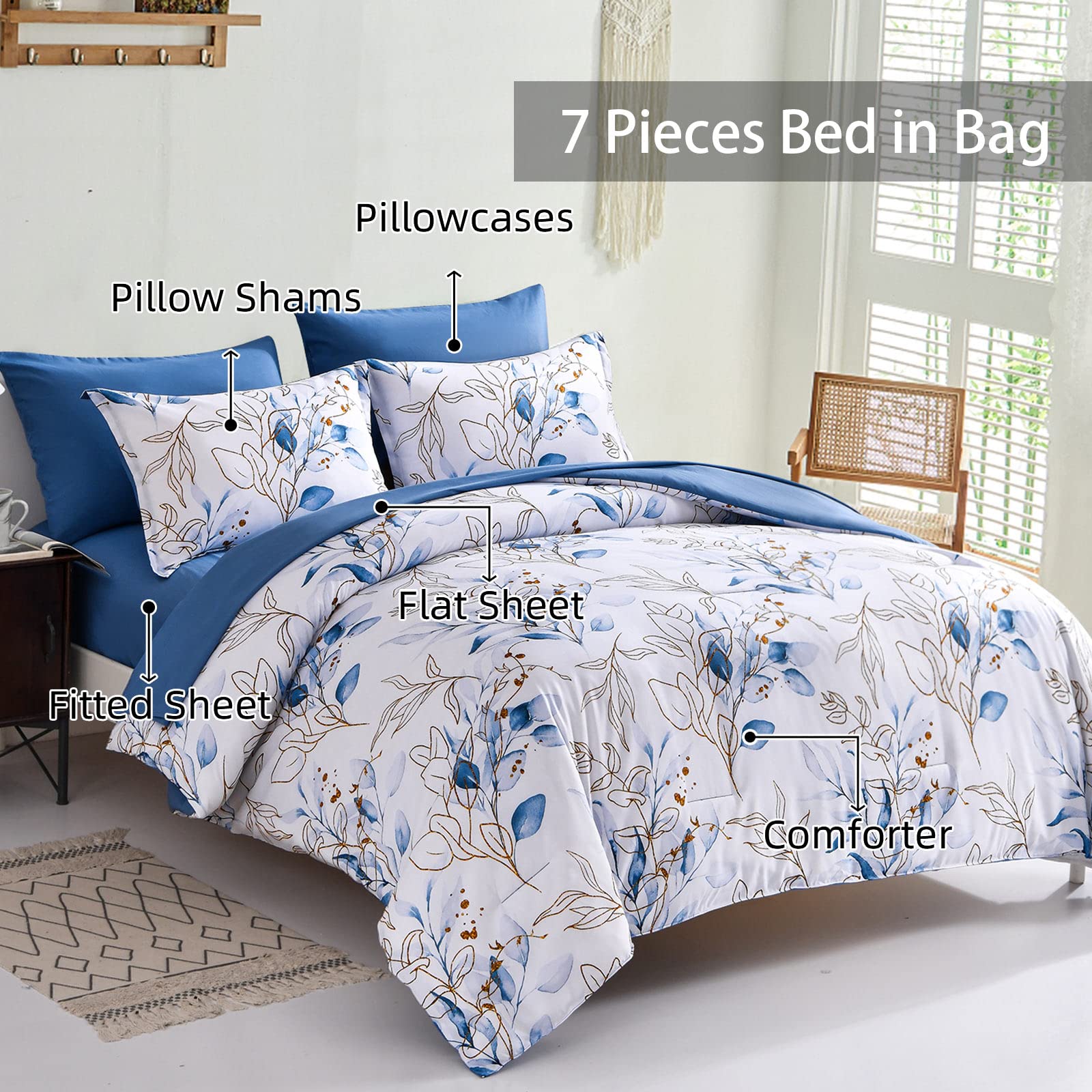 - 7 PIECES BED IN A BAG : This blue comforter set include 7 Pieces: 1 comforter set(90”x90”)+2 pillow shams(20”x26”)+2 pillowcases(20”x30”)+1 fitted sheet(60”x80”+12")+1 flat sheet(90”x102”)