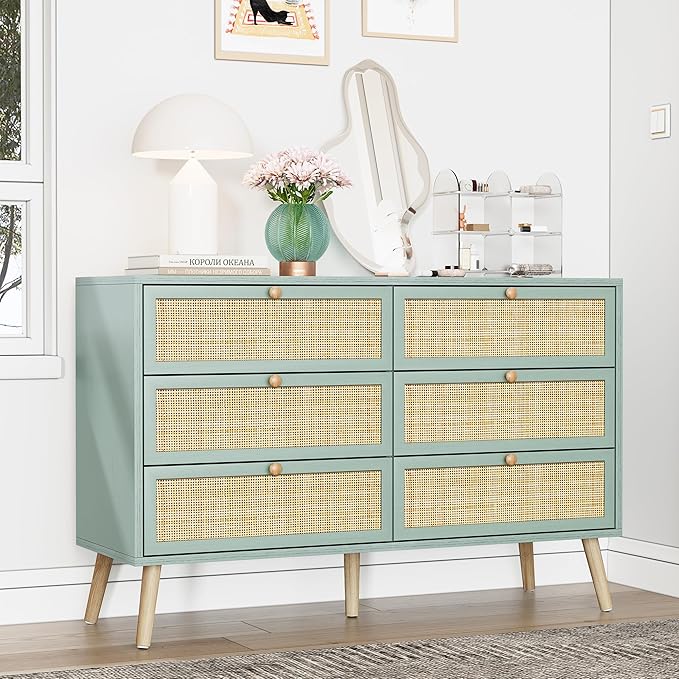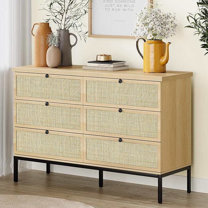 - Premium Material & Sturdy and Durable This 6-drawer dresser is made of high-grade MDF environmental material, the drawer door is made of natural rattan with round metal knobs. This material is safe and environmentally friendly, ensuring no danger and no peculiar smell. The sturdy steel bottom with steel legs is very strong, making the dresser stronger in load-bearing capacity and not easily deformed.