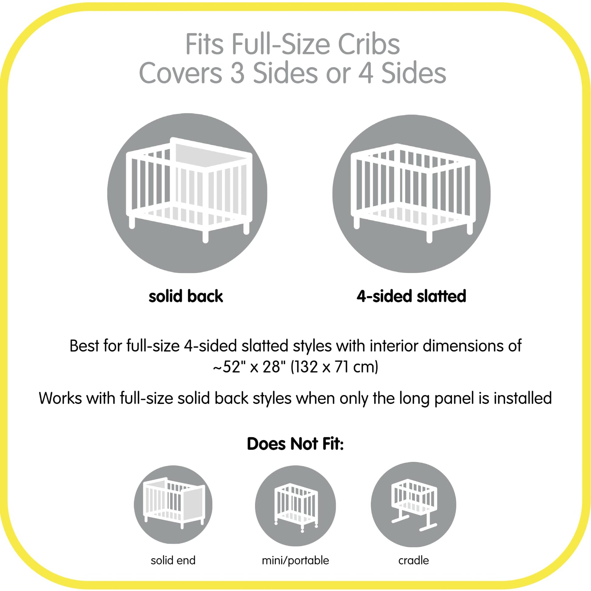 - FITS FULL-SIZE STYLES WITH A 52" x 28" (132 CM x 71 CM) MATTRESS: Install long 11" x 111" (28 cm x 282 cm) and short 11" x 82" (28 cm x 208 cm) panels to cover 4 sides or only the long panel to cover 3 sides. Do not use on solid end styles or mini cribs.