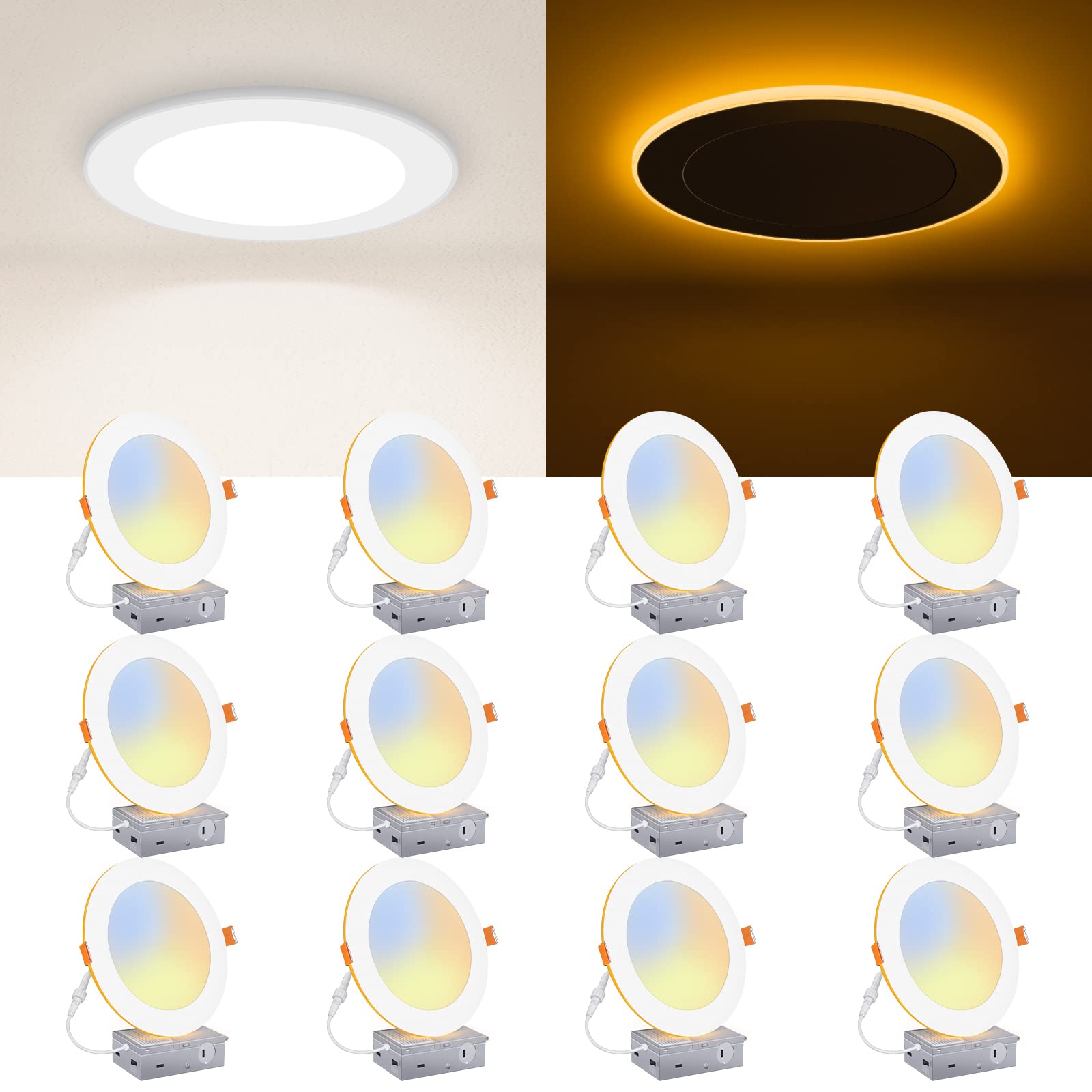 - Dual Functionality - This 12-pack of 6-inch LED recessed lights offers dual modes - a cozy 2700K night light mode and a 5CCT downlight mode, easily switchable using the ON/OFF wall switch. This feature is ideal for those seeking a subtle and warm glow at night. Moreover, the night lighting provides added safety and comfort for nighttime awakenings.